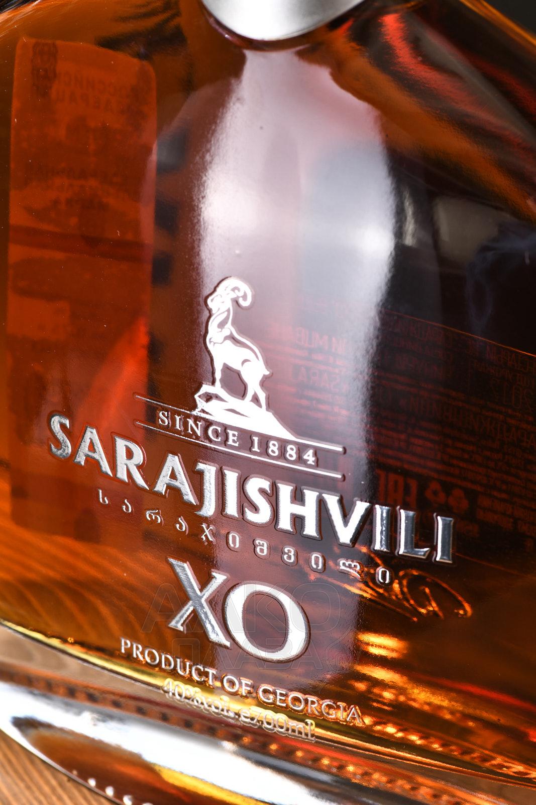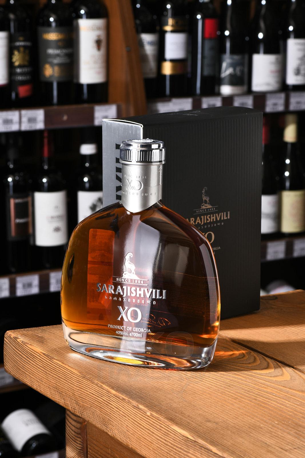 Коньяк Sarajishvili XO производится в Грузии и характеризуется натуральным составом, т. к. является смесью отборных виноградных спиртов с минимальной выдержкой 10 лет. Вызревание прошло в новых бочках из иберийского дуба, изготовленных вручную. Сорокаградусный напиток доступен для покупки в подарочной бутылке широкой плоской формы (объем 700 мл), помещенной в минималистичную черную картонную коробку.
