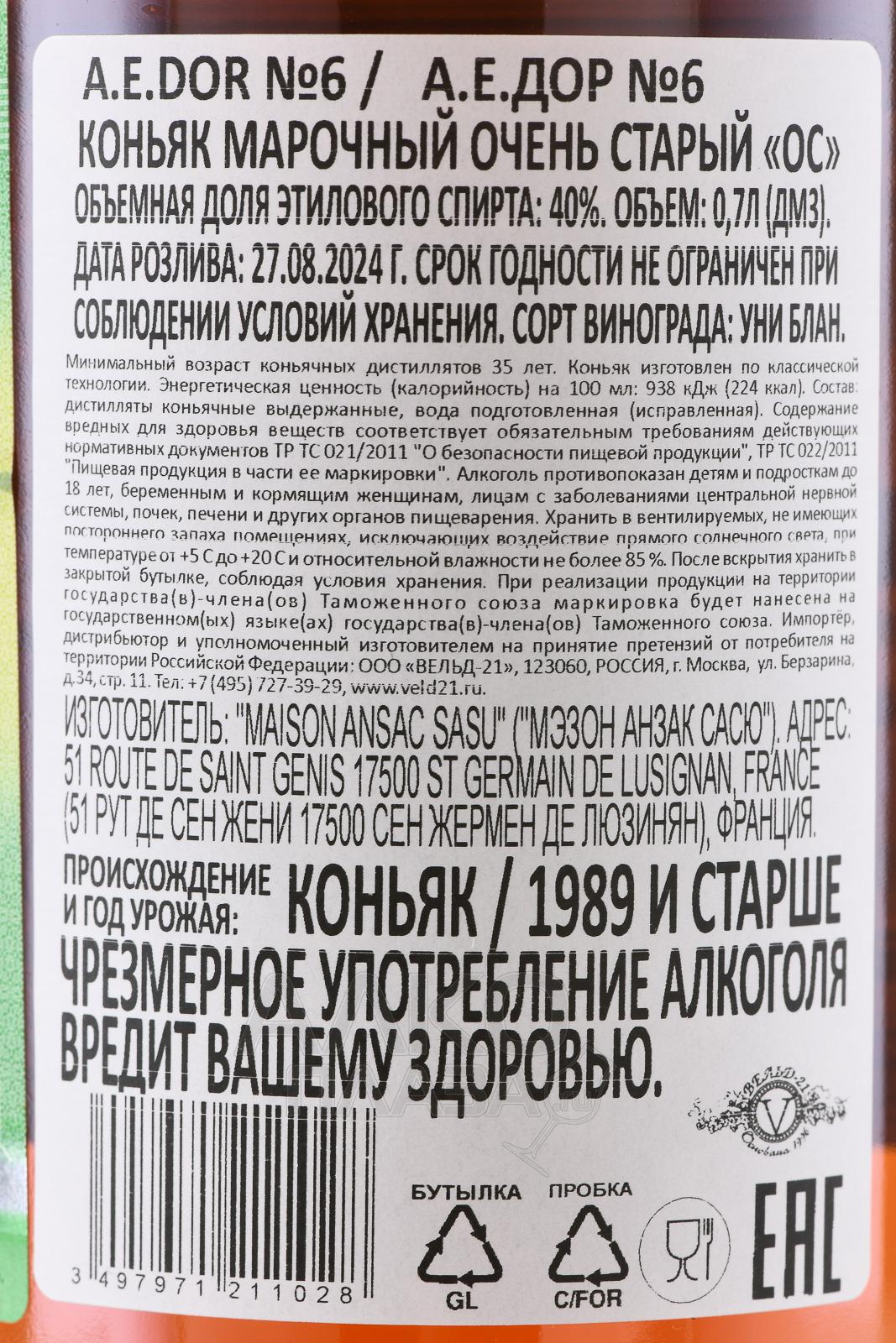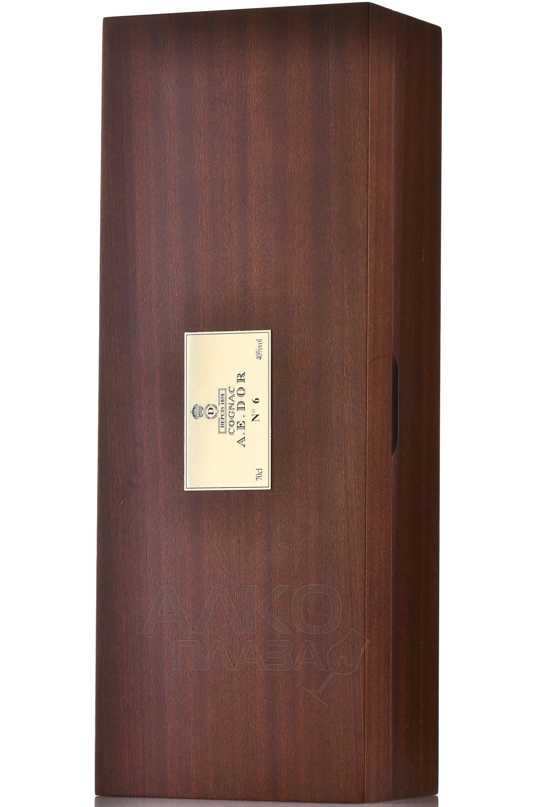 Cognac A.E. Dor №6 - является уникальной смесью спиртов из региона Гранд Шампань. Их возраст начинается от 25 лет и выше. Коньяк является гордостью дома А.Е. Dor. Имеет кофейно-шоколадный аромат, с легкими нотами карамели. Во вкусе можно почувствовать оттенки печеного яблока, сливочного печенья и специй. Очень долгое развитие в бокале позволит Вам получить огромное удовольствие от распития этого напитка. Идеален в качестве дижестива.