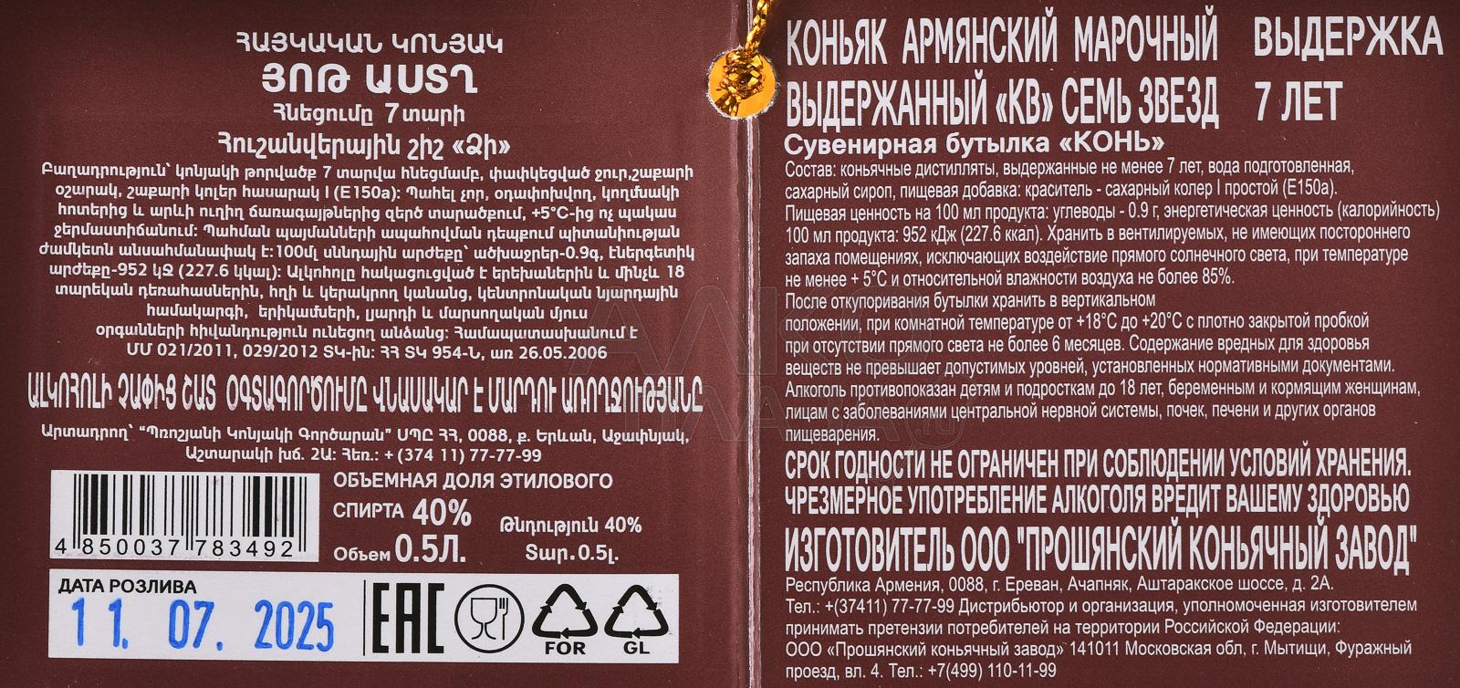 Коньяк Семь звезд 7 лет сувенирная бутылка Конь 0.5 л в п/у