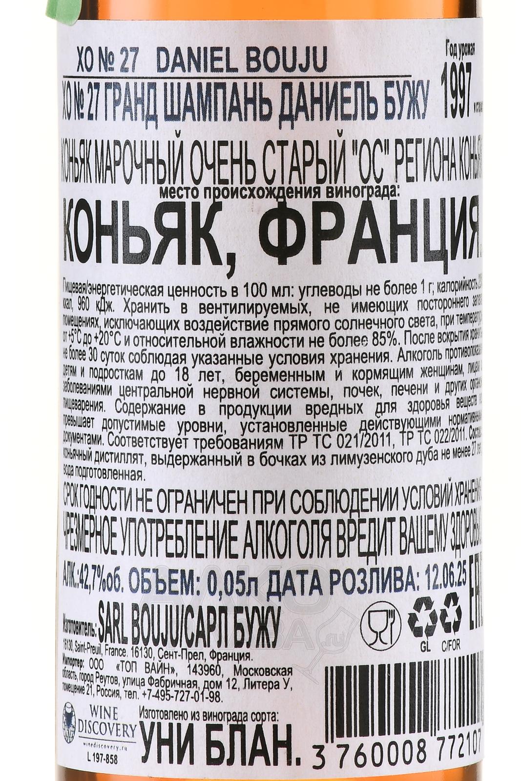 Коньяк Daniel Bouju XO №27 Grande Champagne 0,05 л создан в самом сердце региона Гран Шампань, где лучшие виноградники дают сырье для самых изысканных спиртов. Дом Даниель Бужу, известный своей приверженностью к ремесленным методам, использует исключительно традиционные аламбики малого объема для медленной дистилляции. Такой подход позволяет сохранить богатство и глубину сортового характера. Виноград здесь произрастает на меловых почвах, которые удерживают влагу и тепло, создавая стабильный микроклимат. Выдержка спиртов проходила в бочках из лимузенского дуба более двух десятилетий, что придало напитку мощь и благородную зрелость.