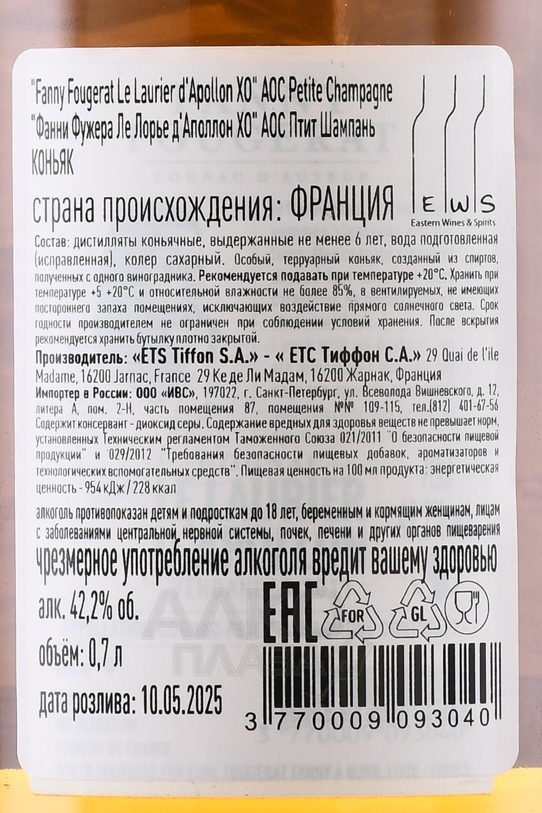 Коньяк Fanny Fougerat Le Laurier d`Apollon XO Petite Champagne 0,7 л в п/у создают на виноградниках, расположенных в зоне Пти Шампань. Терруар включает известняковую основу с высоким содержанием мергеля и хорошей водопроницаемостью. Участки лежат на высоте 70–120 метров. Климат — мягкий, с тёплым летом и продолжительной влажной зимой. Урожай собирают вручную. Сусло перегоняют в медных аламбиках, а дистилляты выдерживают в бочках из лимузенского дуба. Первые месяцы созревания проходят в новой древесине, затем спирты переводят в ёмкости, бывшие в употреблении. Средний возраст компонентов превышает двенадцать лет.