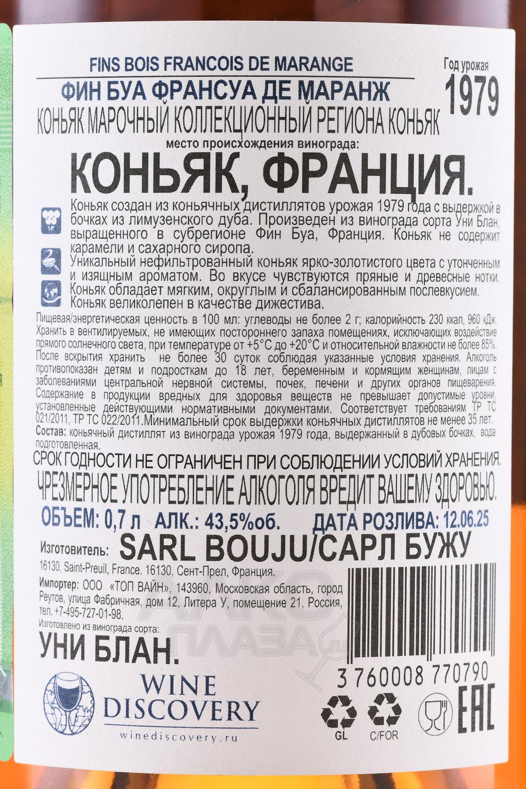 Коньяк Francois de Marange Fins Bois 1979 года 0,7 л в п/у относится к редким коллекционным релизам, созданным из спиртов урожая конца 70-х. Он произведен в регионе Фин Буа, который известен коньяками с мягким характером и богатым фруктовым профилем. Напиток выдерживался в дубовых бочках несколько десятилетий, что придало ему сложную структуру и гармоничное развитие. Особенность выпуска — сохранение подлинного стиля терруара, где почвы и климат региона выразились в глубине вкуса. Упаковка подчеркивает премиальный статус. Такой коньяк нередко отмечается коллекционерами и ценителями старых винтажей, его высоко оценивают критики за баланс и чистоту исполнения.