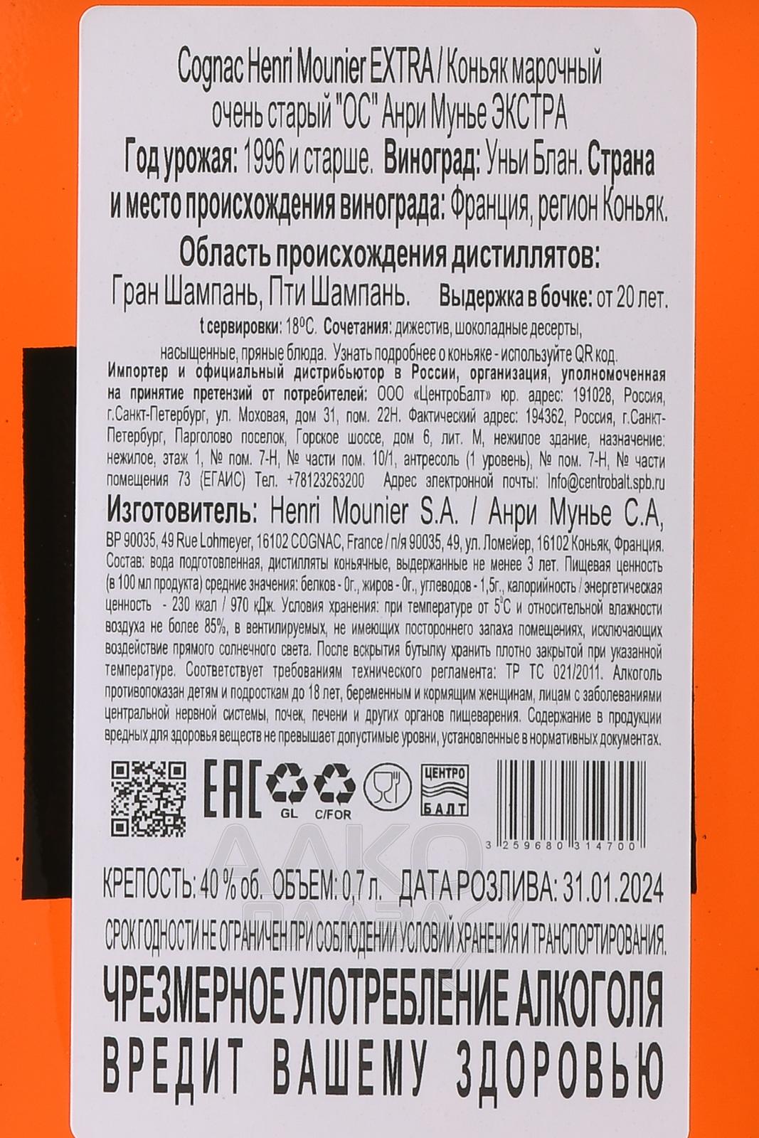Коньяк Henri Mounier Extra 0,7 л относится к премиальной категории благодаря высочайшему качеству спиртов, входящих в его состав, и их солидному возрасту, достигающему 40 лет. Сорокаградусный напиток французского бренда изготовили из винограда ведущих апелласьонов региона Cognac: Petite Champagne и Grande Champagne. Перегонка выполнялась классическим методом в шарантских аламбиках, а вызревание осуществилось в бочонках из древесину Тронсэ и Лимузен. Коньяк в изящном графине укомплектован подарочной коробкой в черно-серых благородных тонах.