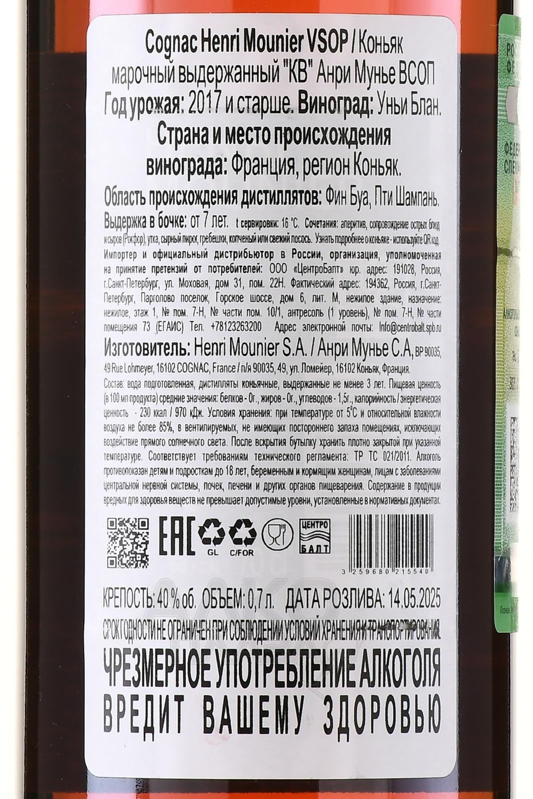 Коньяк Henri Mounier VSOP 0,7 л в п/у с двумя бутылками – элегантный сувенир для особо торжественных случаев. Предлагаемый в презентабельной упаковке напиток изготовлен из урожаев распространенного на юго-западе Франции белого сорта винограда, ставшего популярным после эпидемии филлоксеры. Винификации подвергли урожаи из различных микротерруаров, что позволило создать многогранный и выразительный бленд. Не менее 4 лет после перегонки о-де-ви отдыхали во французском дубе, прежде чем их купажировали и бутилировали с предварительным понижением крепости. На производство пошли плоды винтажа 2015 года и старше.