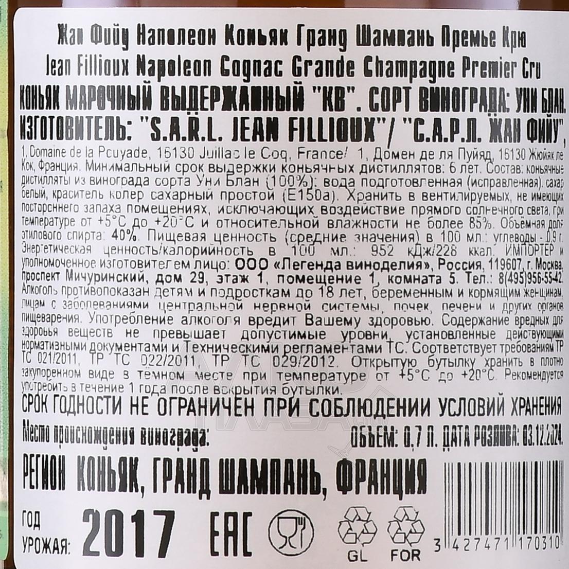 Коньяк Jean Fillioux Napoleon Vieux Cognac Grande Champagne Premier Cru 0,7 л в п/у станет подходящим подарком для ценителя. Он представляет собой купаж из отборных спиртов, самый молодой из которых — 6-летний (урожая 2014 года). В роли сырья использовался сорт Уни Блан, выращенный в субрегионе Гран Шапмань на винограднике со статусом Премьер Крю. Дистилляты выдерживаются исключительно в бочках из лимузенского дуба, причем первые полгода они проводят в новых емкостях. Бочки обжигаются в течение минимум 15 минут. Нынешний владелец коньячного дома Фийу использует в производстве семейные секреты и рецепты, накопленные предыдущим поколением, что позволяет создавать индивидуальный, неповторимый стиль.