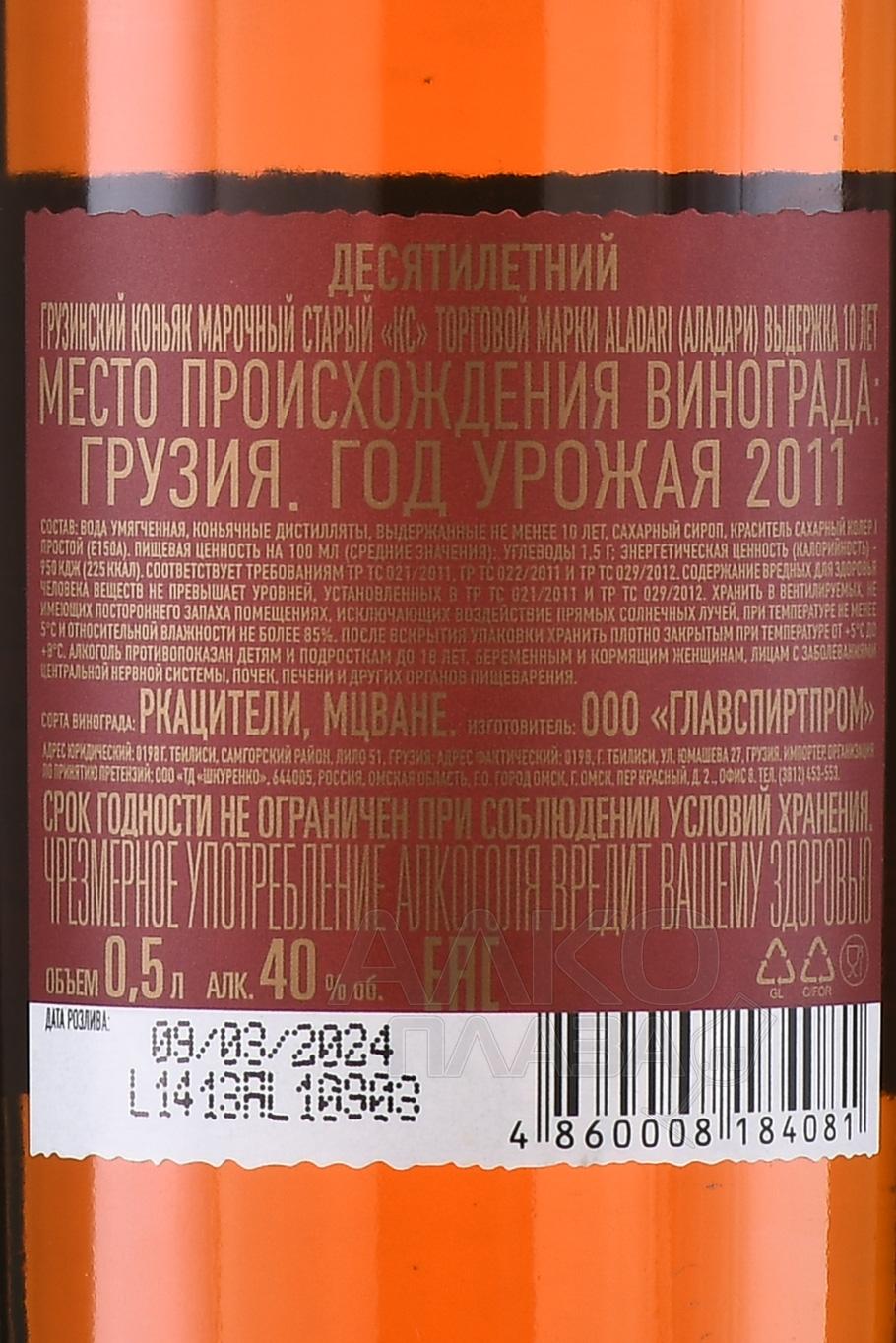 Коньяк Аладари КС 10 лет 0,5 л — выдержанный напиток с богатым и утонченным вкусом. Это классический коньяк категории XO, сочетающий в себе терруарные черты, грузинский колорит и традиции выдержки в дубе. В роли сырья выступили автохтонные сорта, выращенные на виноградниках Алазанской долины в Восточной Грузии. При производстве использовали купаж винтажных дистиллятов, которые созревали в бочках из французского дуба. Марочный коньяк помимо глубокого янтарного цвета и мягкого букета отличается длительным тепловым послевкусием. Он получил высокие оценки на международных конкурсах, включая серебро на European Spirits Challenge, а российские и зарубежные критики отмечают сбалансированность и элегантность его профиля.