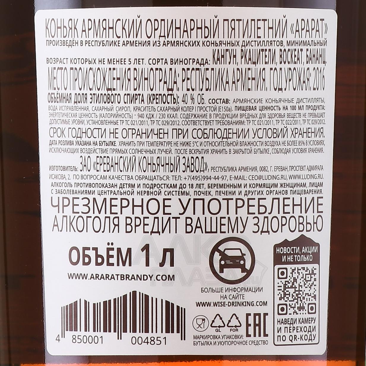 Коньяк Арарат 5 лет 1 л – это выдержанный армянский напиток, созданный по традиционной технологии из автохтонных армянских и грузинского сортов винограда, выращенного в Араратской долине. Регион отличается жарким летом, холодной зимой и большим количеством солнечных дней, что позволяет ягодам накапливать сахар и сохранять яркую кислотность. Урожай собирают вручную, затем перерабатывают в виноматериалы, которые подвергаются двойной дистилляции в медных аламбиках. Далее спирты выдерживаются не менее пяти лет в дубовых бочках из кавказского дуба. Такой метод позволяет добиться мягкого вкуса и гармоничного букета.