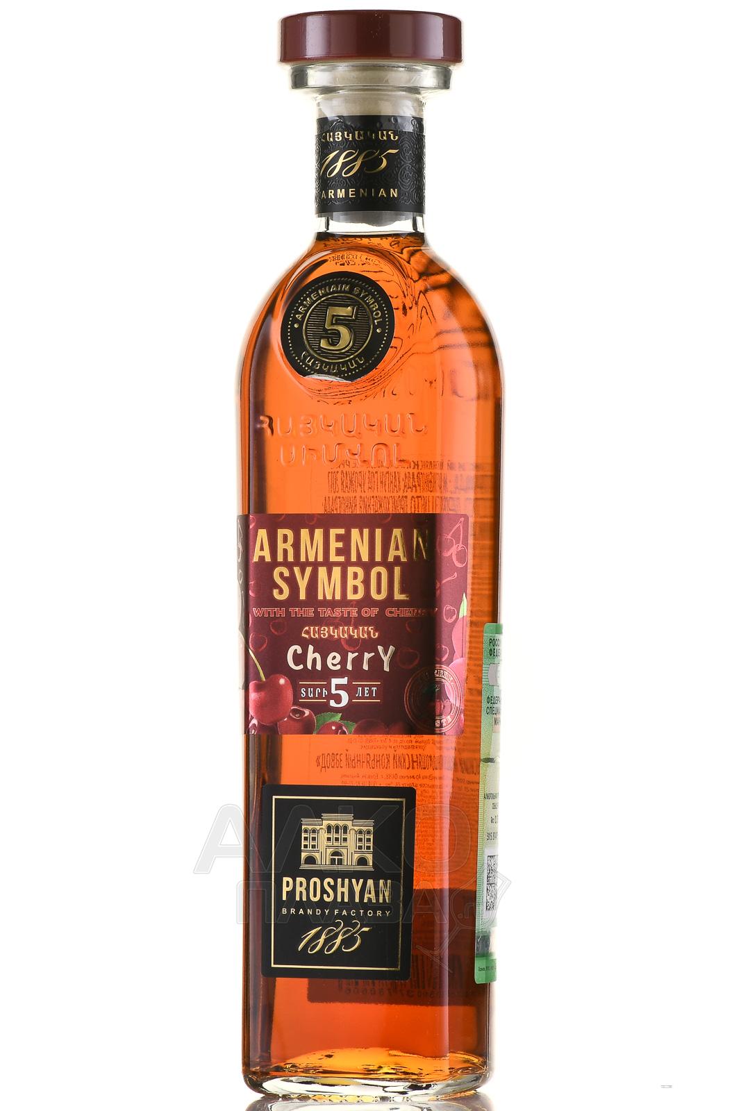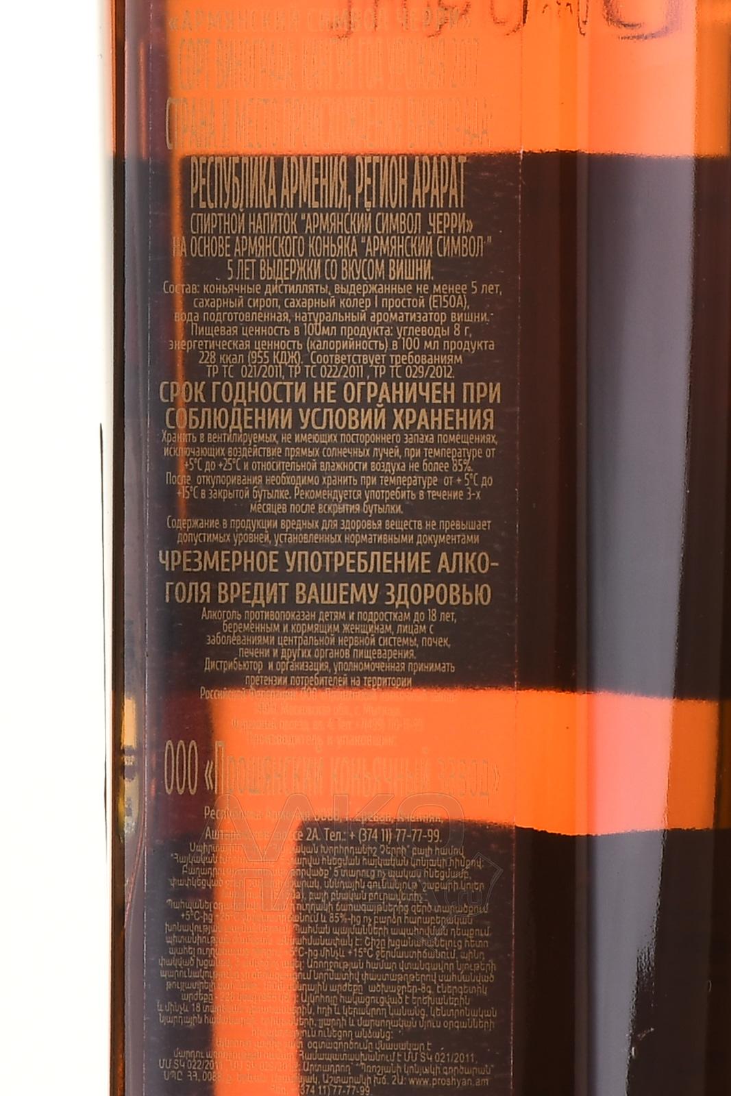 Коньяк Армянский символ Черри 0,5 л — армянский бренди, созданный на основе пятилетних коньячных спиртов, выдержанных в бочках из кавказского дуба. Для производства используются автохтонные белые сорта винограда, ягоды которого созрели в условиях жаркого лета и прохладной зимы, накопив достаточно сахара и развив яркую ароматику. После двойной дистилляции спирты выдержали 5 лет, затем купажировали с мягкой родниковой водой и натуральным вишневым экстрактом, придавшим напитку характерный фруктовый профиль.