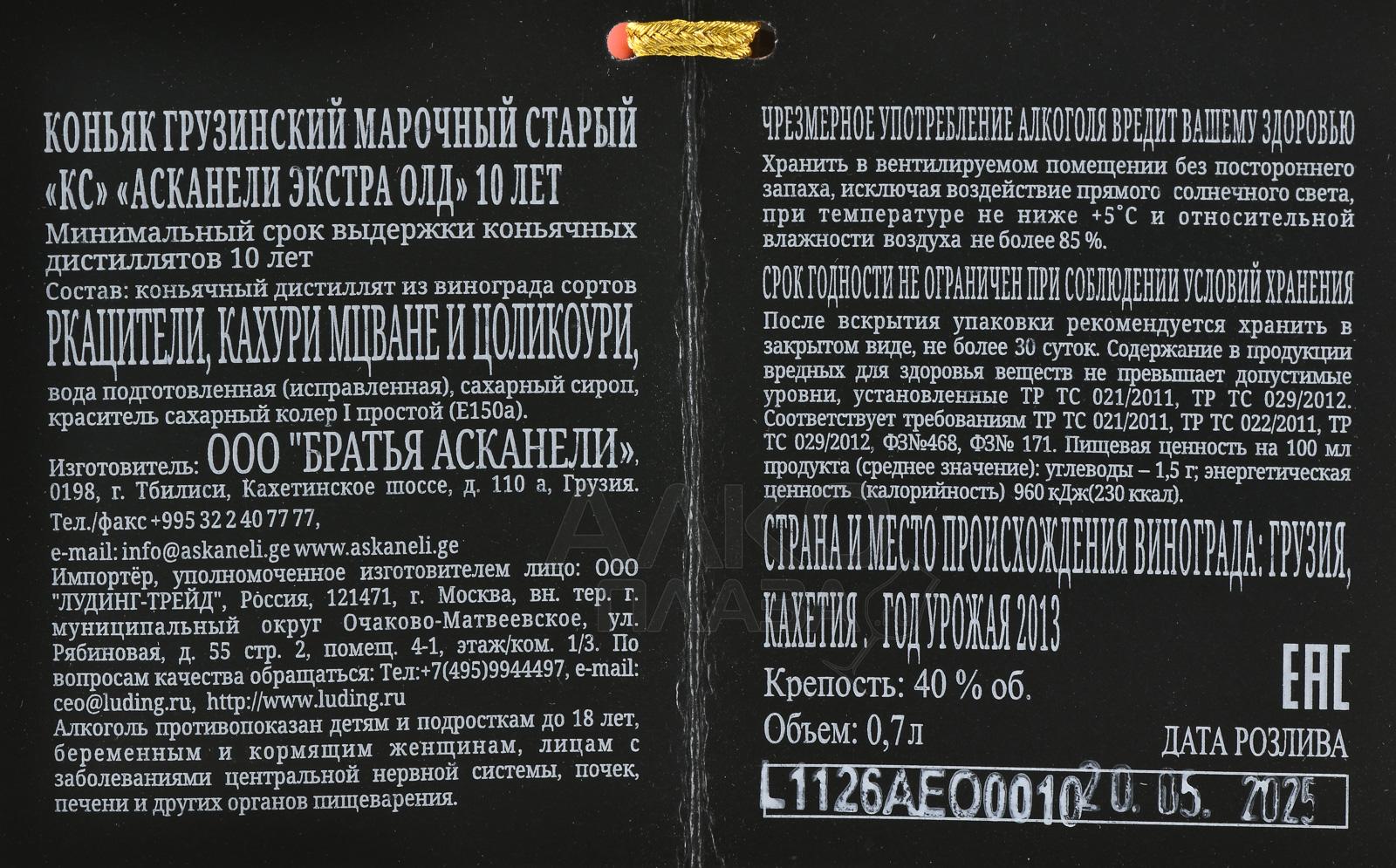 Коньяк Асканели Экстра Олд 10 лет 0,7 л в п/у — это выдержанный грузинский дистиллят, созданный на основе виноградного сырья из ключевых зон Кахетии. Напиток получают из спиртов, которые созревают не менее десяти лет в дубовых бочках, что приобретая сложность и мягкую структуру. Виноград для производства выращивают на тёплых аллювиальных и суглинистых почвах, где высокий уровень солнечного освещения и значительный перепад температур формируют плотный урожай. Дистилляты проходят двойную перегонку и затем — выдержку в кавказском дубе.