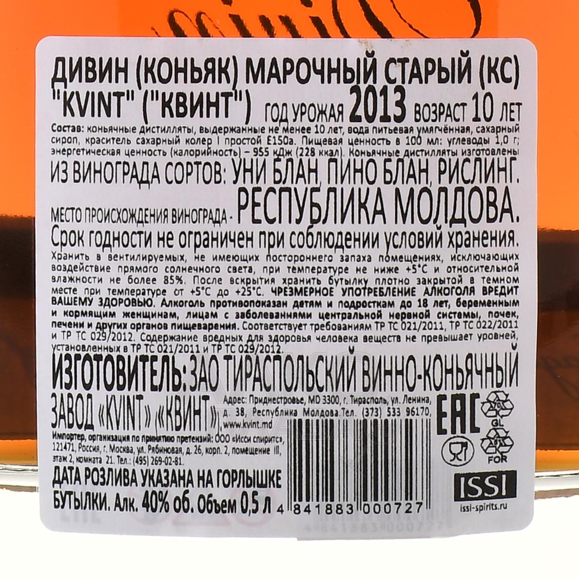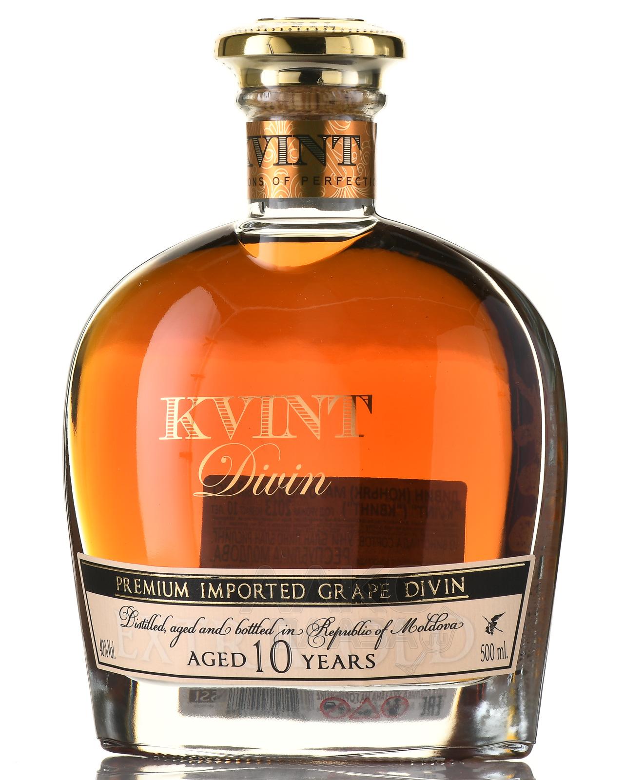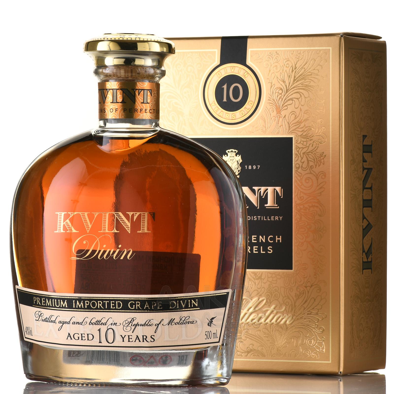 Коньяк Kvint Divin 10 лет — молдавский качественный алкогольный напиток марочной категории, спиртуозность которого достигает 40 градусов. Для его производства использовались белые сорта винограда — в том числе европейские, обработанные по методами сбраживания и перегонки. Коньяк провел в дубовых бочках не менее 10 лет, прежде чем подвергся розливу по бутылкам.