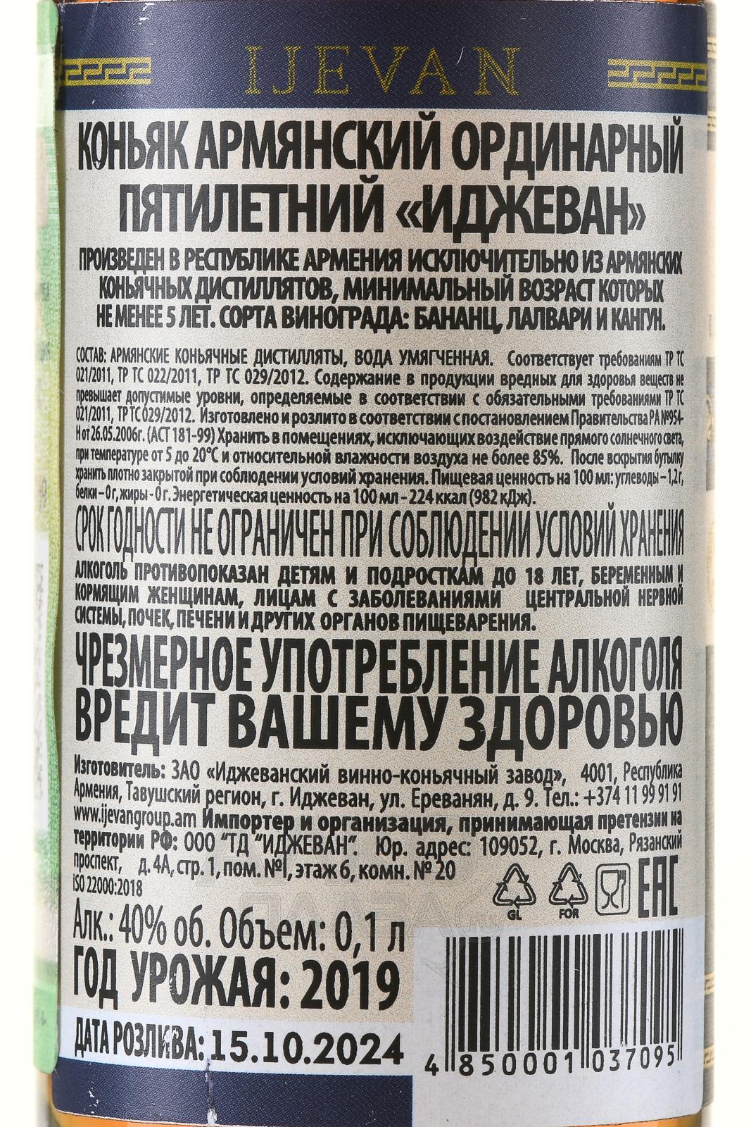 Коньяк Иджеван 5 лет 0,1 л — один из самых популярных напитков из ассортимента Иджеванского ВКЗ, предлагаемый в шкалике для покупки в ознакомительных целях или коллекционирования. Бутылка миниатюрного объема выполнена в фирменной стилистике армянского производителя. Налитый в нее сорокаградусный коньяк объединяет спирты белого винограда возрастом 5 лет и выше. Приятный вкусоароматический букет вариации сформировала выдержка в отборных дубовых барриках.