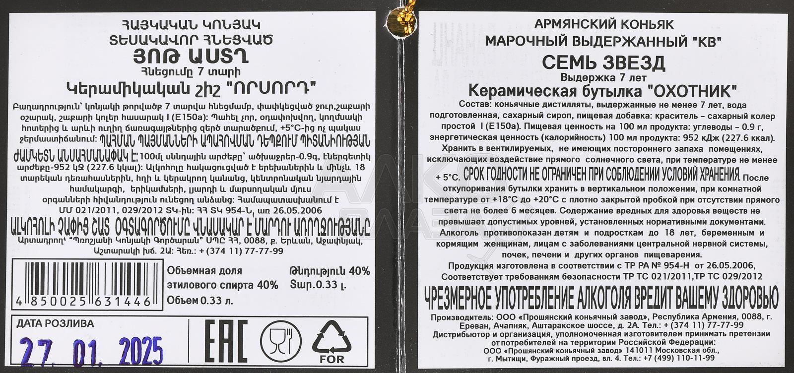 Коньяк КВ Семь звезд 7 лет сувенирная бутылка Охотник 0.33 л п/у был создан мастерами коньячного искусства Армении в строгом соответствии с традициями выдержки и купажирования. Виноград белых аборигенных вариаций был тщательно отобран и ферментирован естественным способом, после чего напиток выдерживали в специальных дубовых бочках на протяжении семи лет. Уникальность процесса производства заключалась в медленном созревании при постоянной температуре и влажности, благодаря чему коньяк приобрел исключительную мягкость и благородный характер. Бутылка выполнена в форме охотника, подчёркивая эксклюзивность и сувенирный статус продукта.