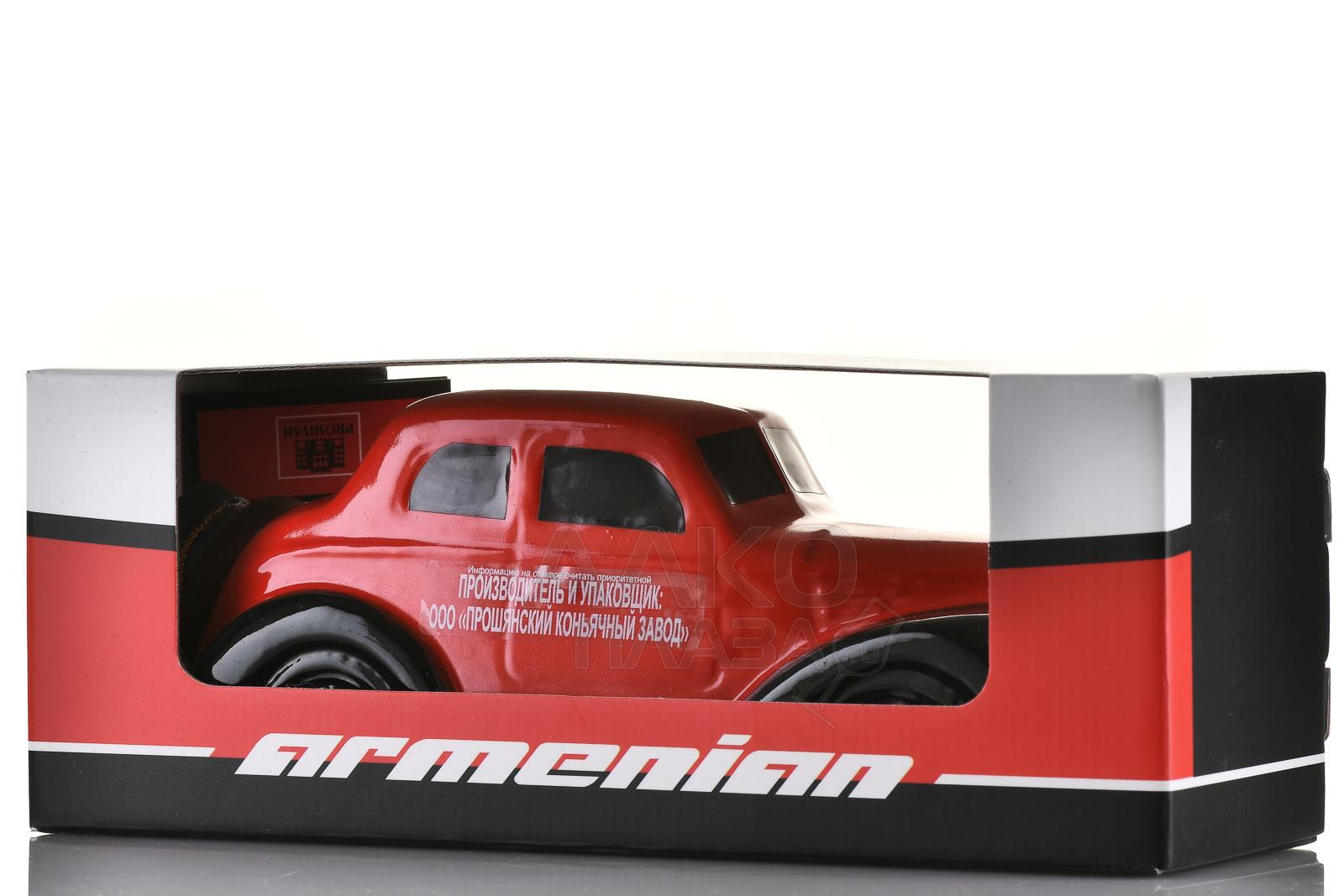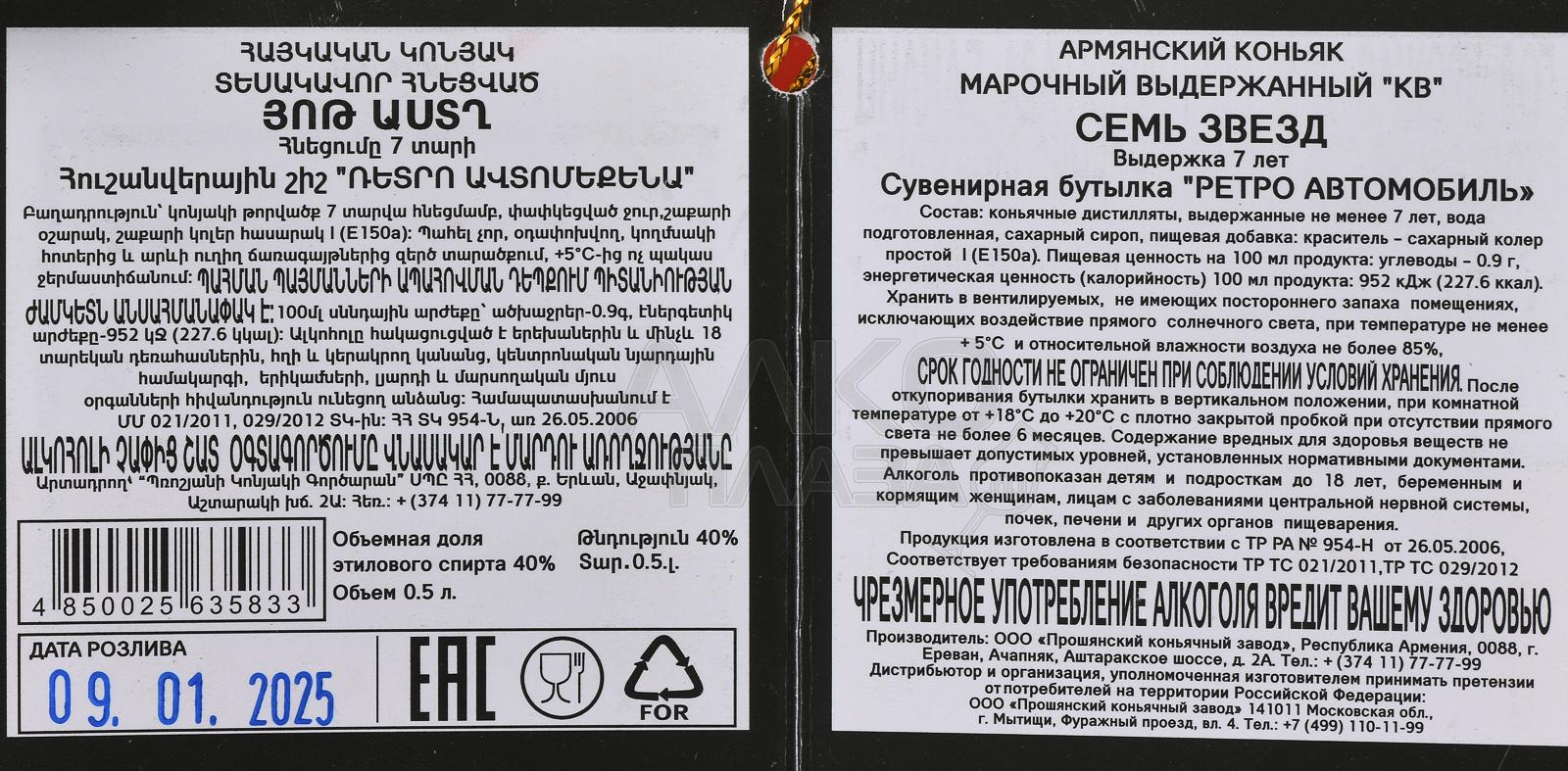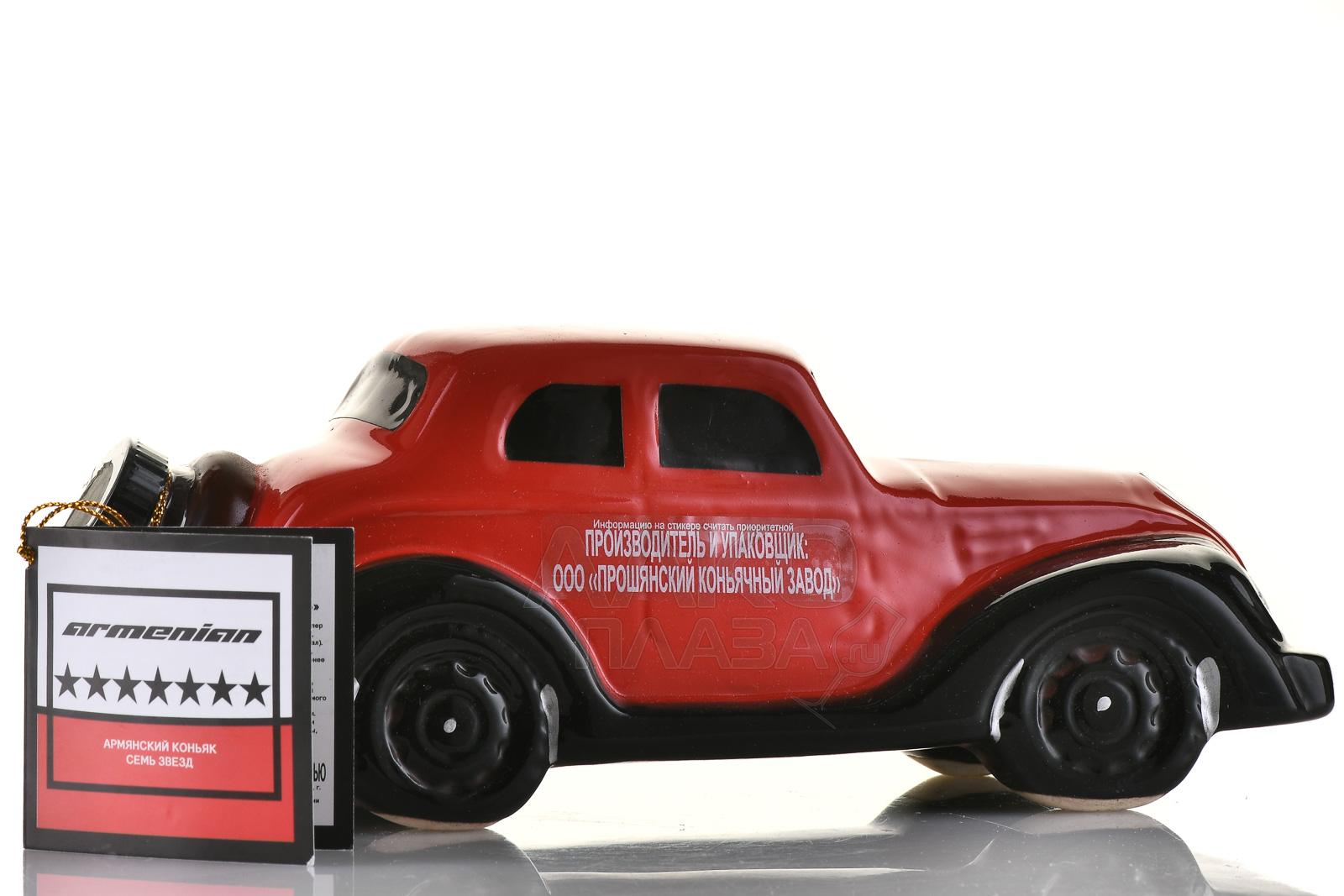 Коньяк КВ Семь звезд 7 лет сувенирная бутылка Ретро Автомобиль 0.5 л п/у был изготовлен по классической армянской технологии двойной перегонки молодых вин из сортов винограда автохтонной группы. Выдерживался напиток семь лет в бочках из кавказского дуба, где он приобрел глубокие ноты пряностей, древесины и сухофруктов. Особое внимание уделялось ручной отделке сувенирной бутылки в виде ретро автомобиля, что сделало ее эксклюзивным подарочным изделием и ценным экспонатом для коллекционеров.