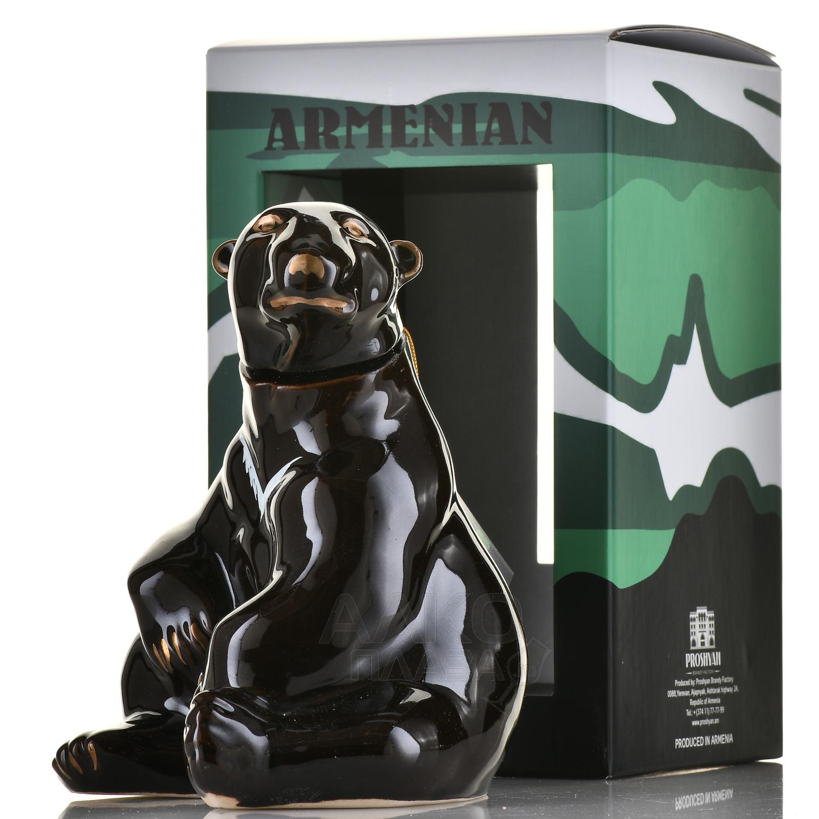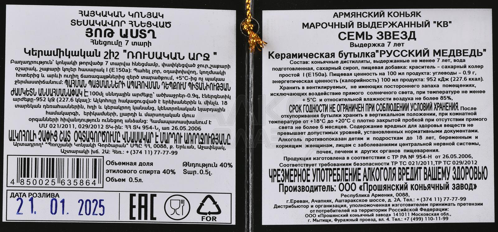 Коньяк КВ Семь звезд 7 лет сувенирная бутылка Русский Медведь 0.5 л п/у изготовлен из винограда сортов аборигенного типа, собранных вручную в высокогорных регионах Армении. Производство осуществлялось традиционным методом двойной перегонки в медных аламбиках с последующим длительным выдерживанием не менее семи лет в дубовых бочках из местного кавказского дуба. Особенностью технологии стало использование артезианской воды, прошедшей естественную фильтрацию через вулканические породы, что придало напитку особую чистоту и мягкость вкуса.
