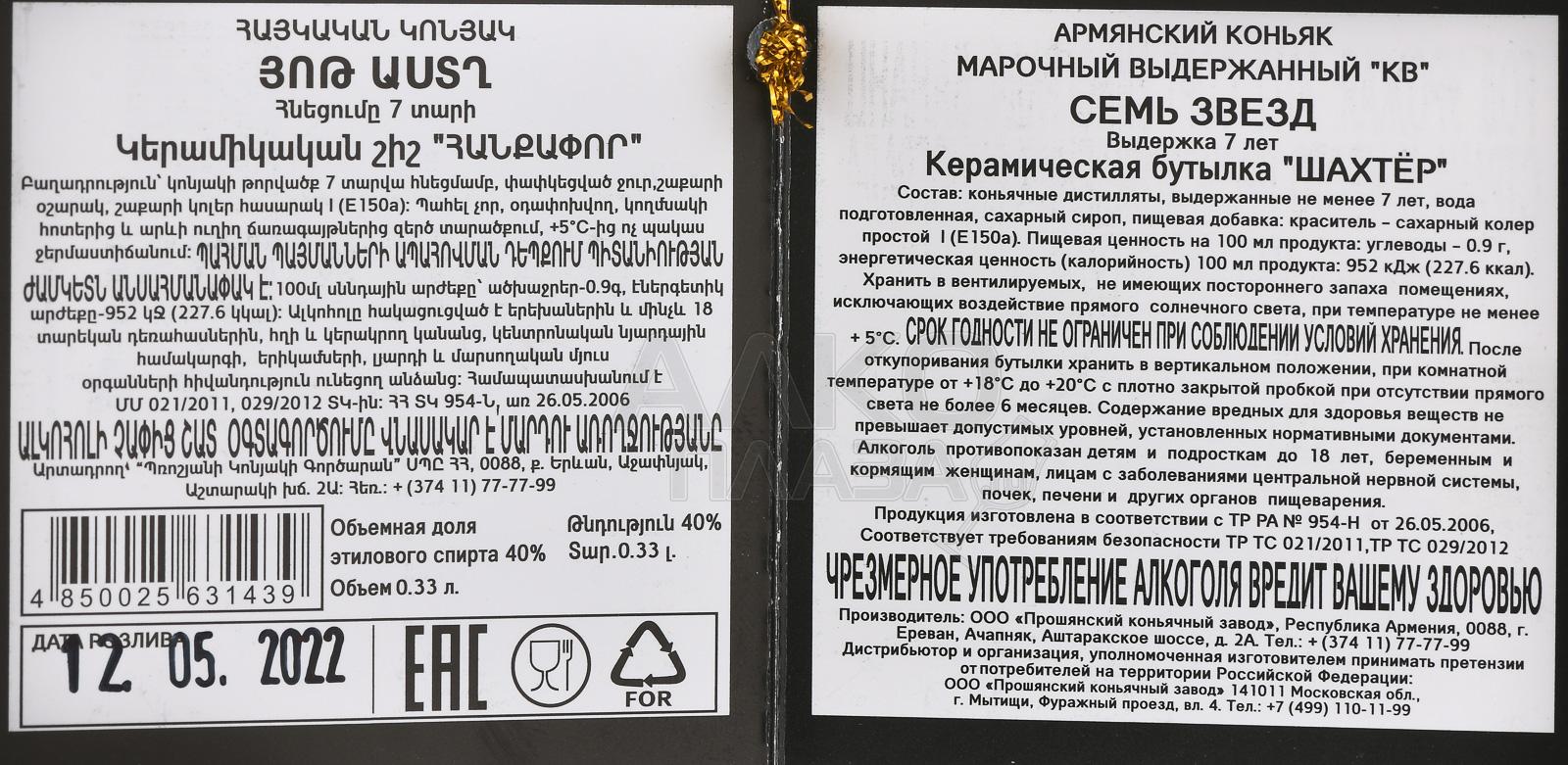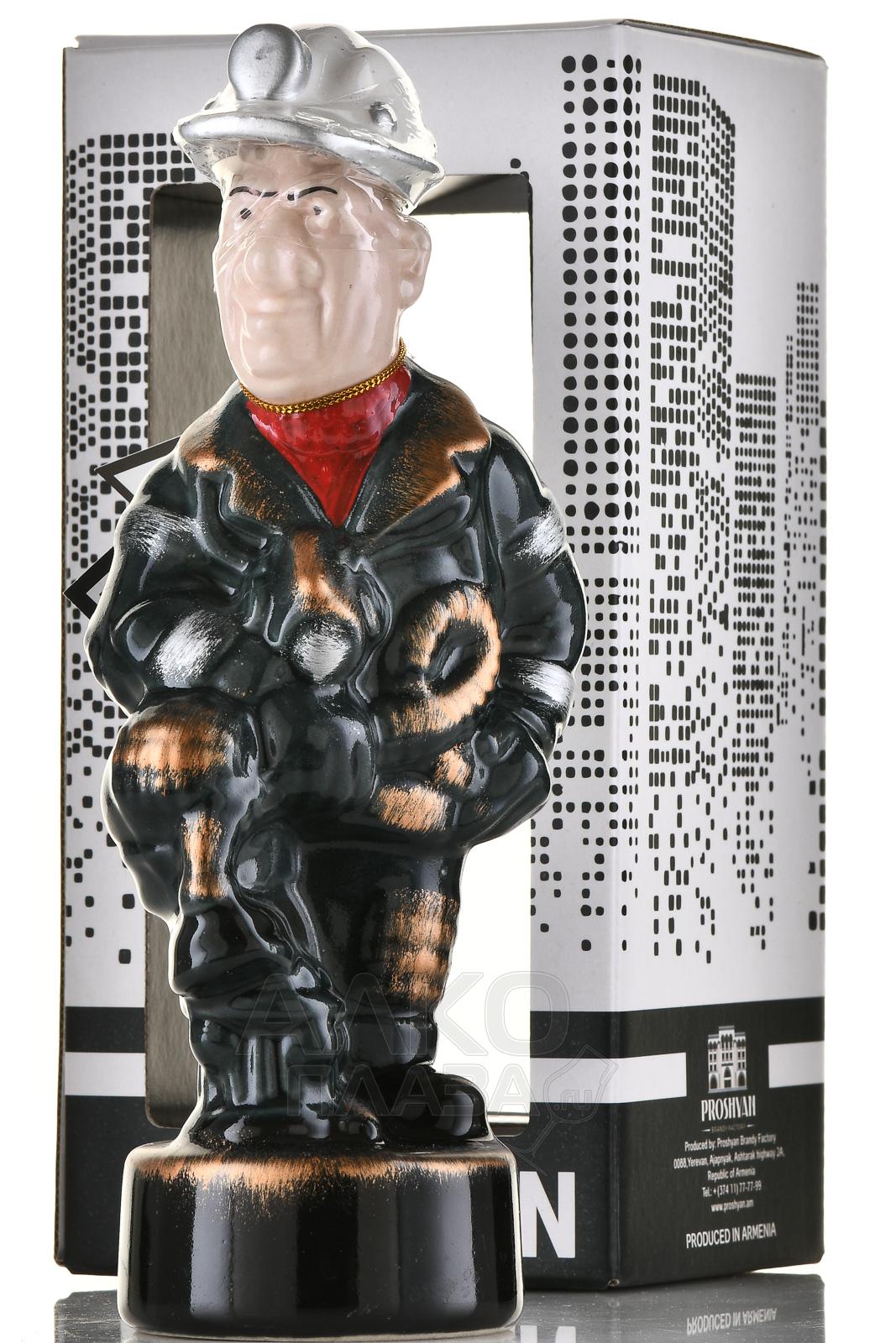 Коньяк КВ Семь звезд 7 лет сувенирная бутылка Шахтер 0.33 л п/у был произведен на основе виноградных спиртов из отборных сортов автохтонного типа. Они выдерживались не менее семи лет в специальных дубовых бочках, благодаря чему напиток приобрел сложный характер и мягкость вкуса. Особенностью технологии стало медленное купажирование, обеспечившее особую гармоничность и утонченный аромат. Коньяк разлит в бутылку, выполненную в виде фигурки шахтера, что сделало ее запоминающимся сувениром.