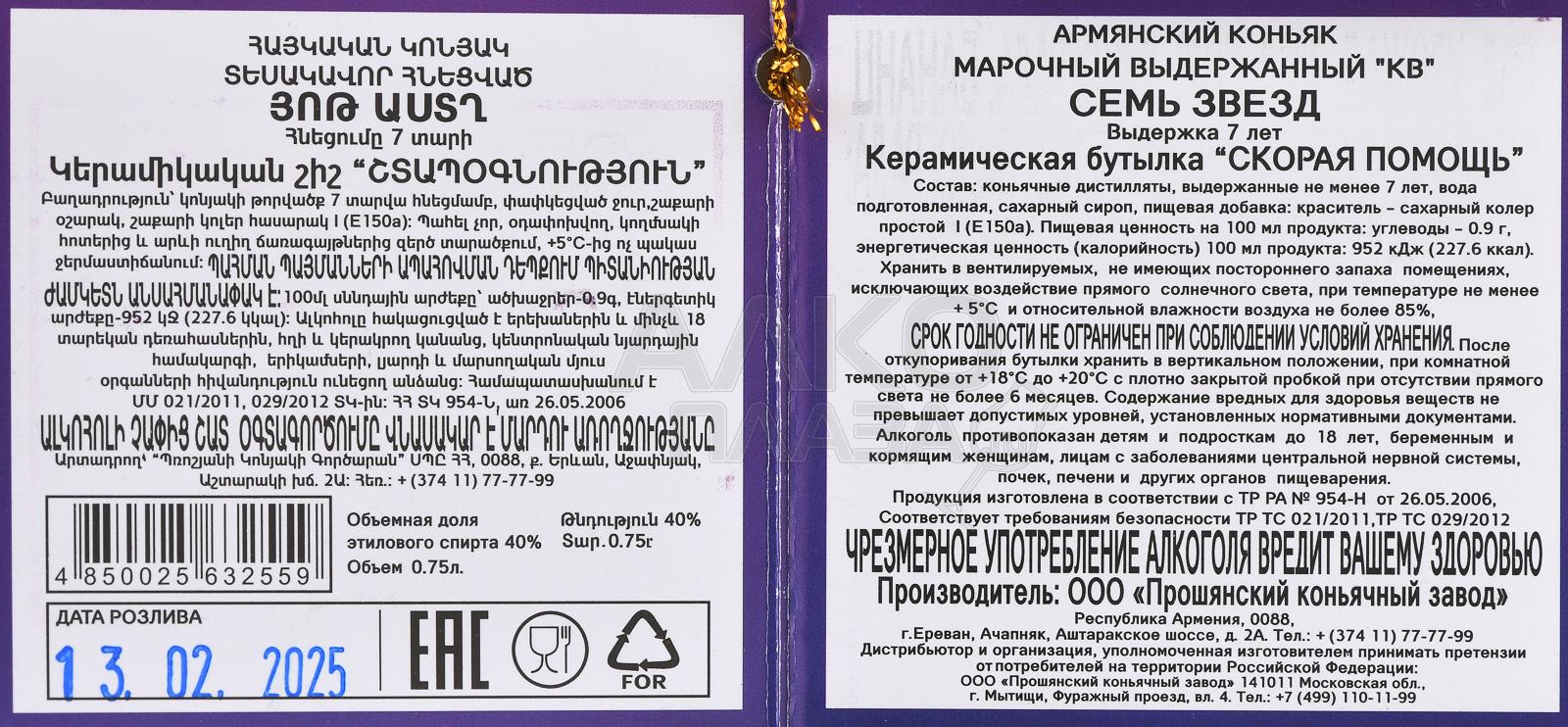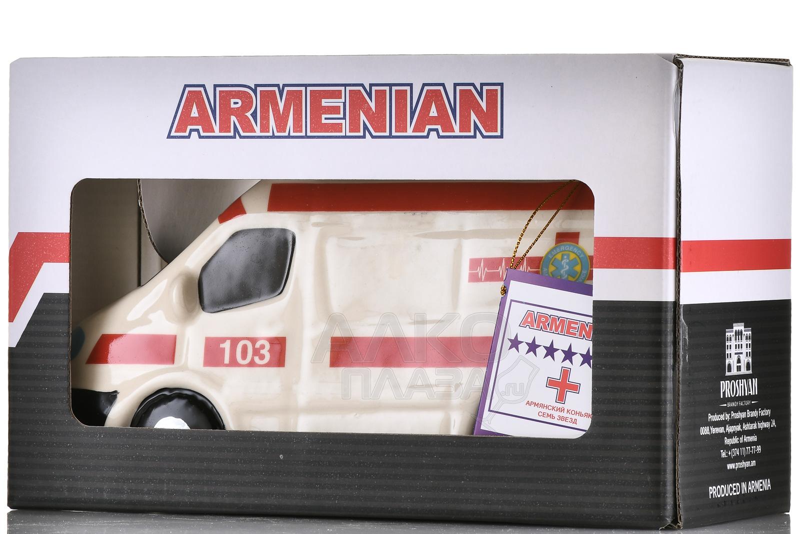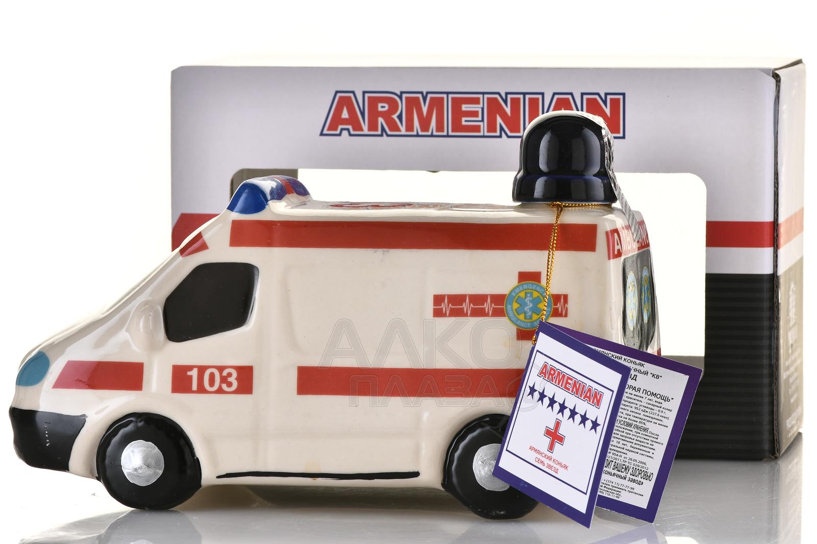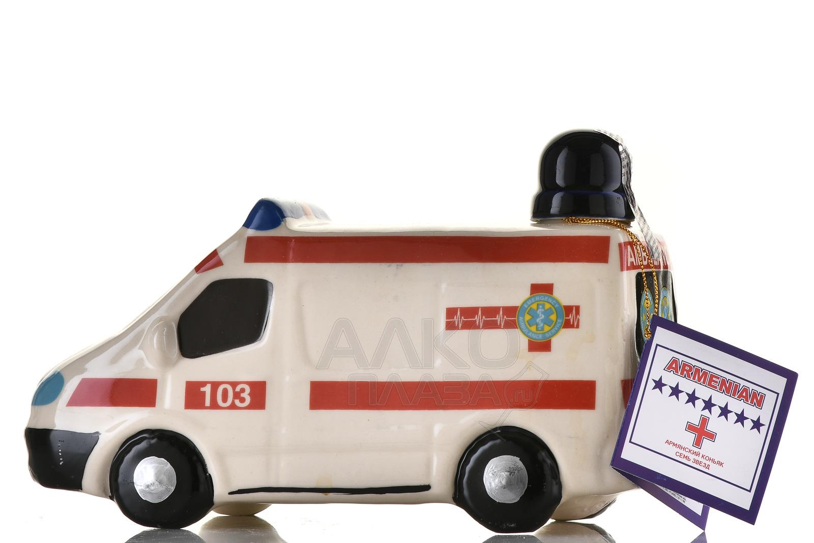 Коньяк КВ Семь звезд 7 лет сувенирная бутылка Скорая Помощь 0,75 л п/у – оригинальный алкоголь от знаменитого Прошянского завода в Армении. Напиток выделяется эффектным оформлением. Он разлит в керамическую бутылку, выполненную в виде машины Скорой Помощи с тщательным изображением всех деталей. Коньяк находится в стильной подарочной коробке. 7-летний сорт — один из самых популярных и востребованных в брендовой линейке. Вариант в сувенирном формате — это отличный презент для работников медицинской сферы, который можно вручить по случаю профессионального праздника, на день рождения или по другому торжественному поводу.