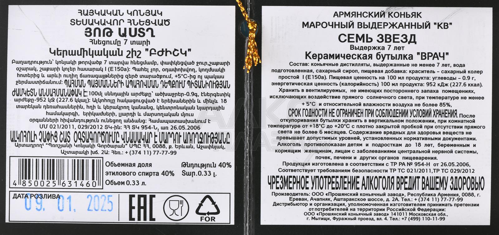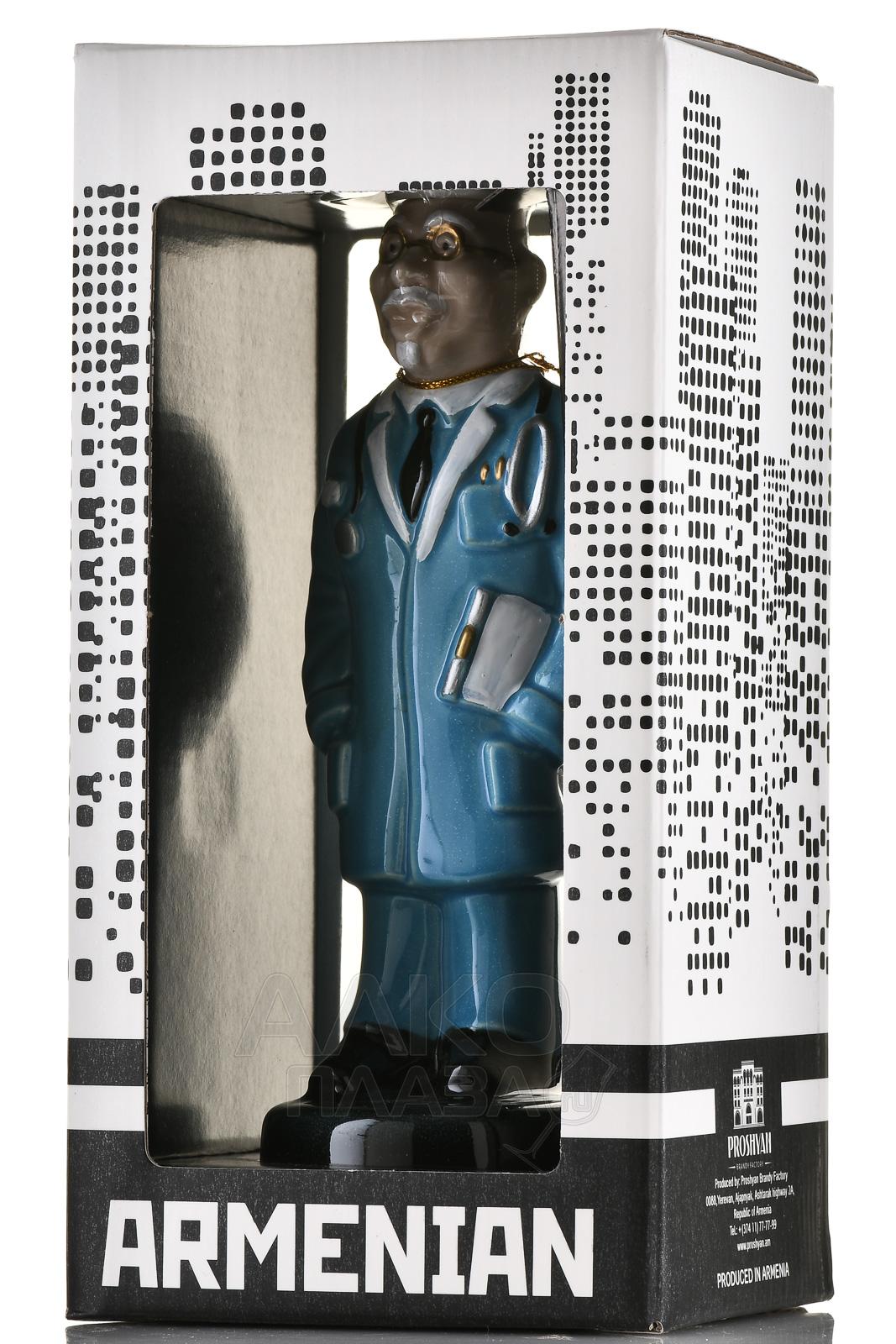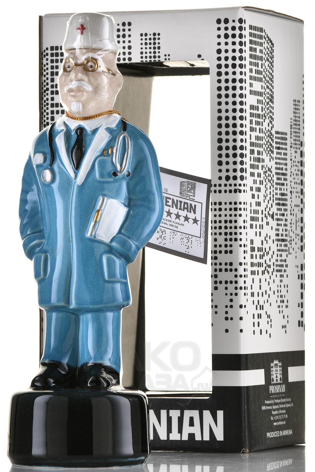 Коньяк КВ Семь звезд 7 лет сувенирная бутылка Врач 0.33 л п/у создан из отборного винограда местных сортов, выращенного на солнечных склонах Араратской долины. Дистилляция проходила в традиционных медных кубах, после чего алкоголь выдерживался в дубовых бочках не менее 7 лет, приобретая изысканную сложность вкуса и бархатистость текстуры. Уникальной особенностью стала сувенирная бутылка, выполненная в форме врача, что подчеркнуло эксклюзивность напитка и сделало его запоминающимся подарком.