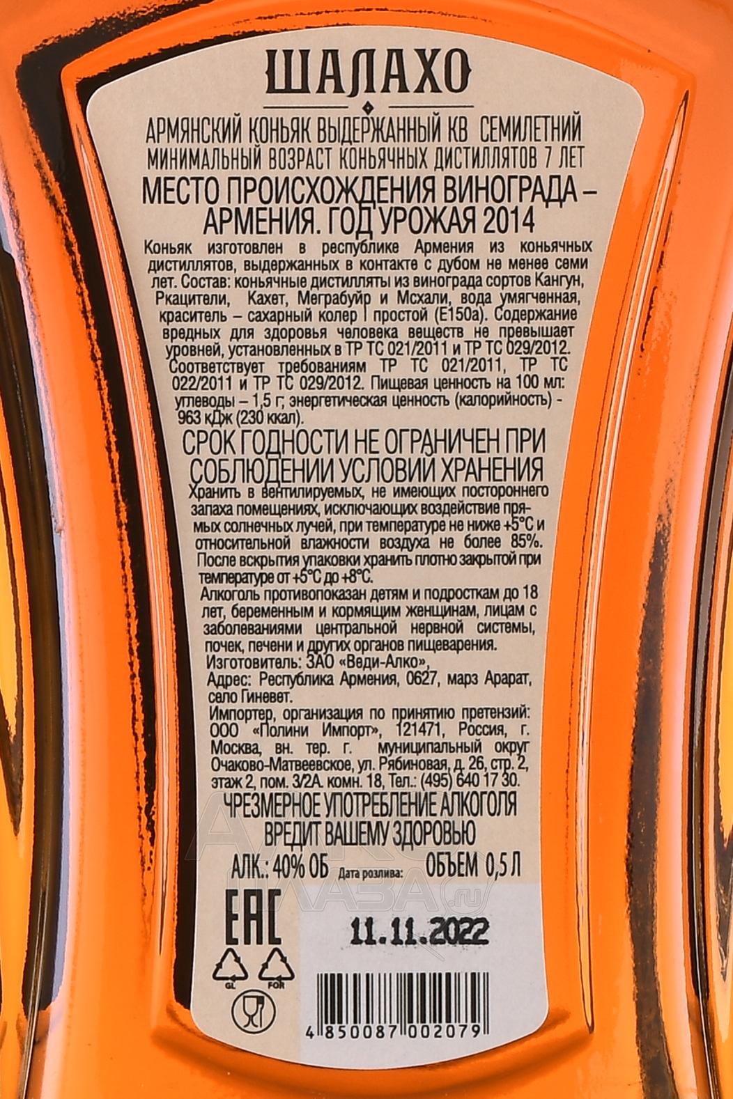 Коньяк КВ Шалахо 7 лет 0,5 л в п/у с бокалом рожден из винограда, выращенного в благородных терруарах Армении, где солнечные дни чередуются с прохладными ночами, а горный рельеф и минеральные почвы создают особый баланс для формирования насыщенного вкуса. Урожай собирается вручную, ягоды проходят мягкое прессование, а сок подвергается традиционной перегонке в медных аламбиках. Выдержка дистиллятов длится не менее семи лет в дубовых бочках, что придает напитку сложный характер, наполненный гармонией и глубиной. Отличие этого бренди — в сочетании древней ремесленной культуры и современных стандартов качества. Он выпускается в подарочной упаковке с аксессуаром, что подчеркивает высокий статус напитка и делает его особенным выбором как для личной дегустации, так и для подарка.