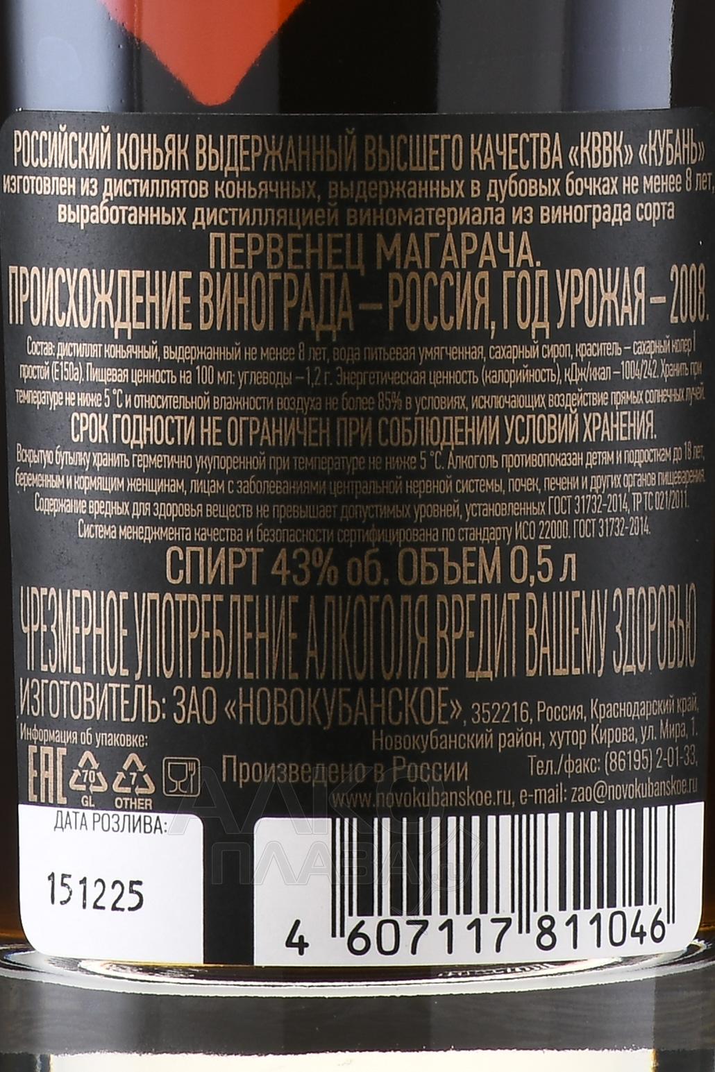 Коньяк КВВК Кубань 8 лет 0,5 л в п/у производится в Краснодарском крае, в регионе с устойчивыми традициями виноградарства и выдержанных виноградных дистиллятов. Основой служат ягоды сорта, выведенного в Крымском институте вина и виноградарства. Из сока плодов сделали белое сухое вино, которое затем перегнали по классической технологии. Далее последовала восьмилетняя выдержка в бочках из дуба. Созревание в контакте с древесиной сформировало цвет, ароматическую сложность и округлость вкуса. Затем выполнили купажирование. Напиток выпускается в подарочной упаковке, что подчёркивает его высокий статус.