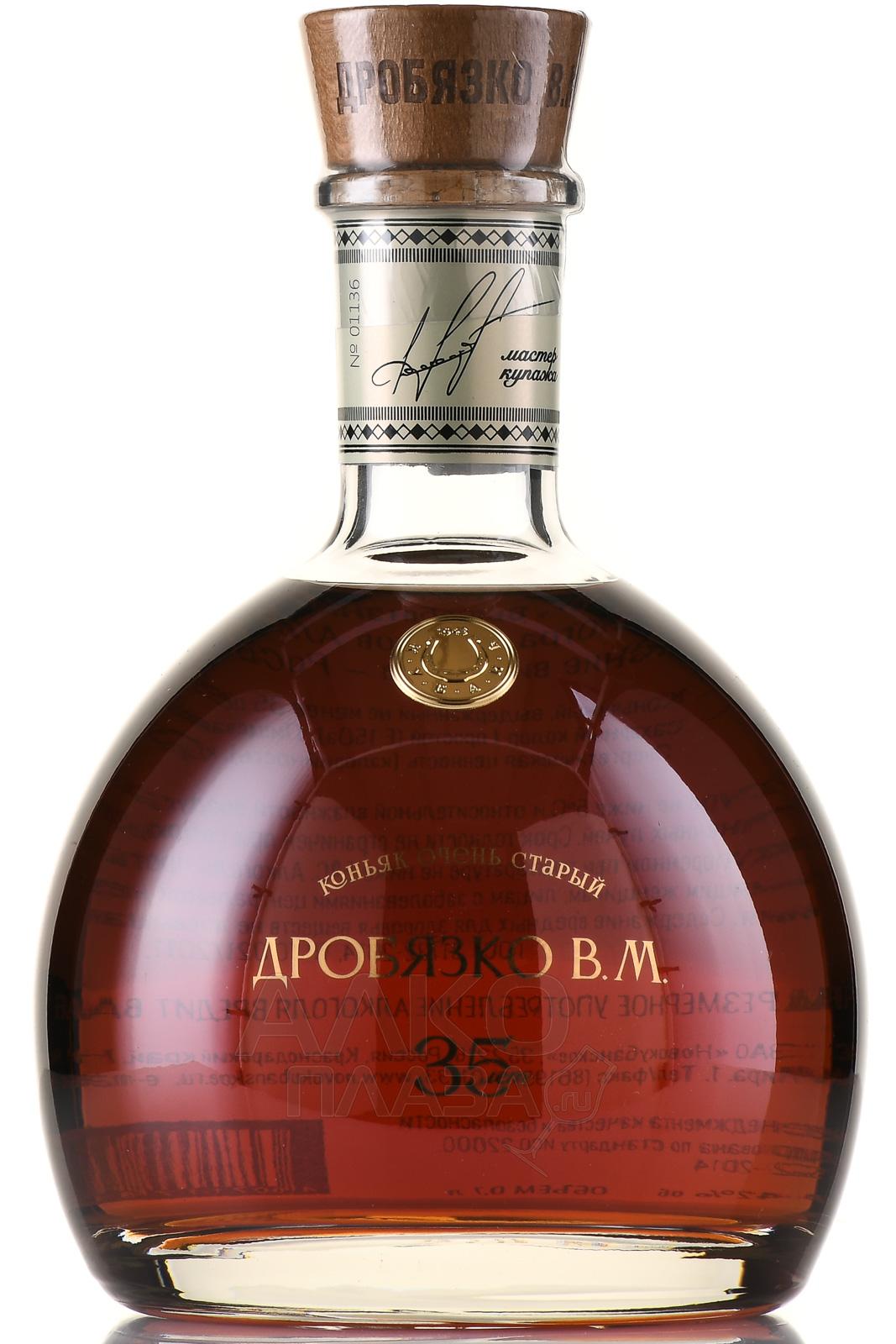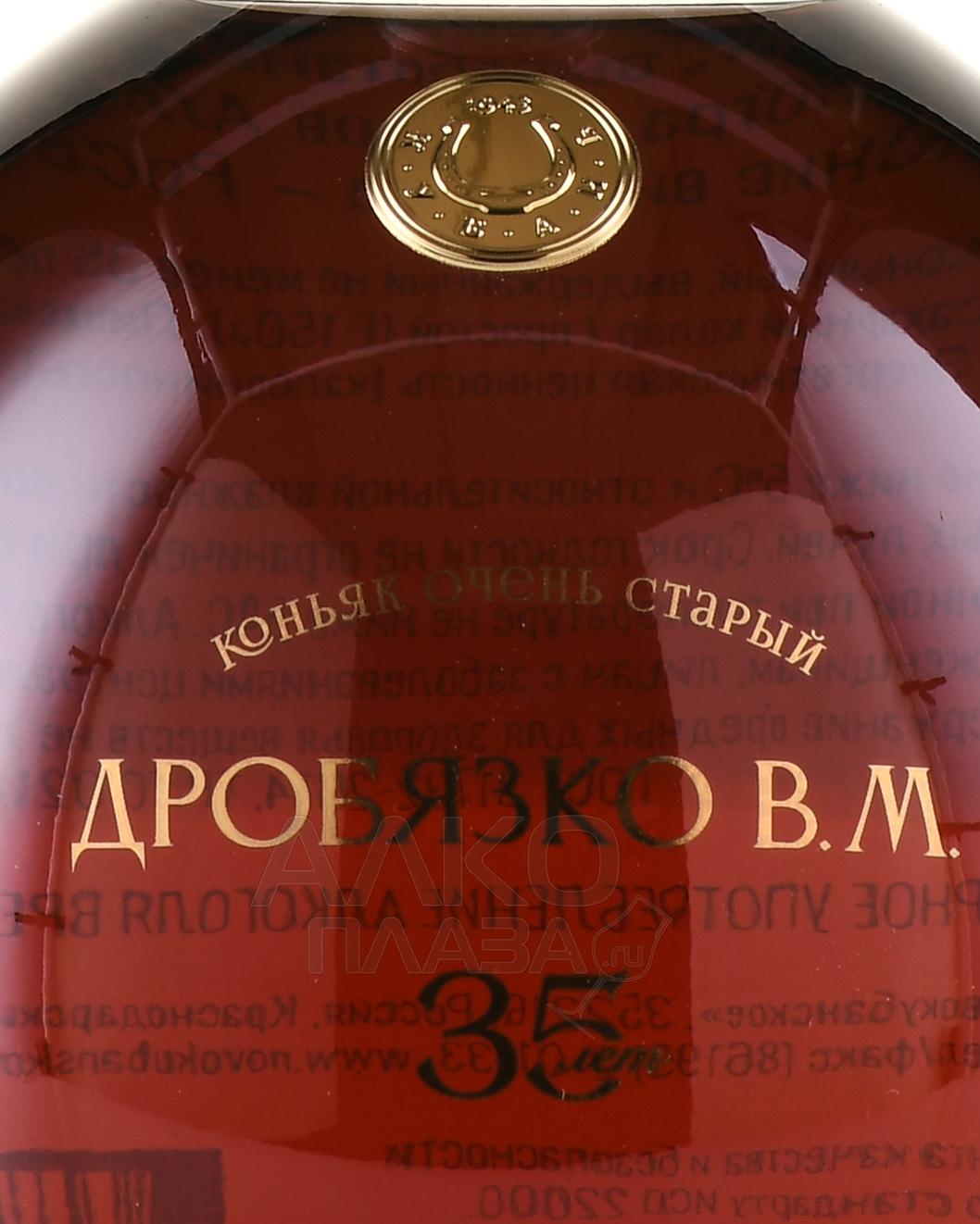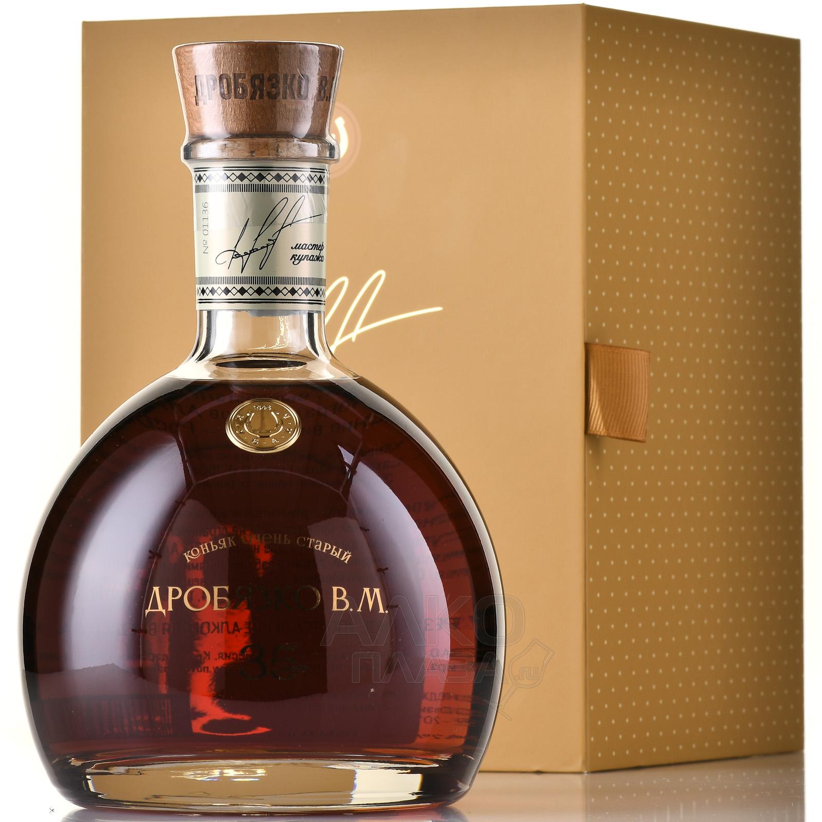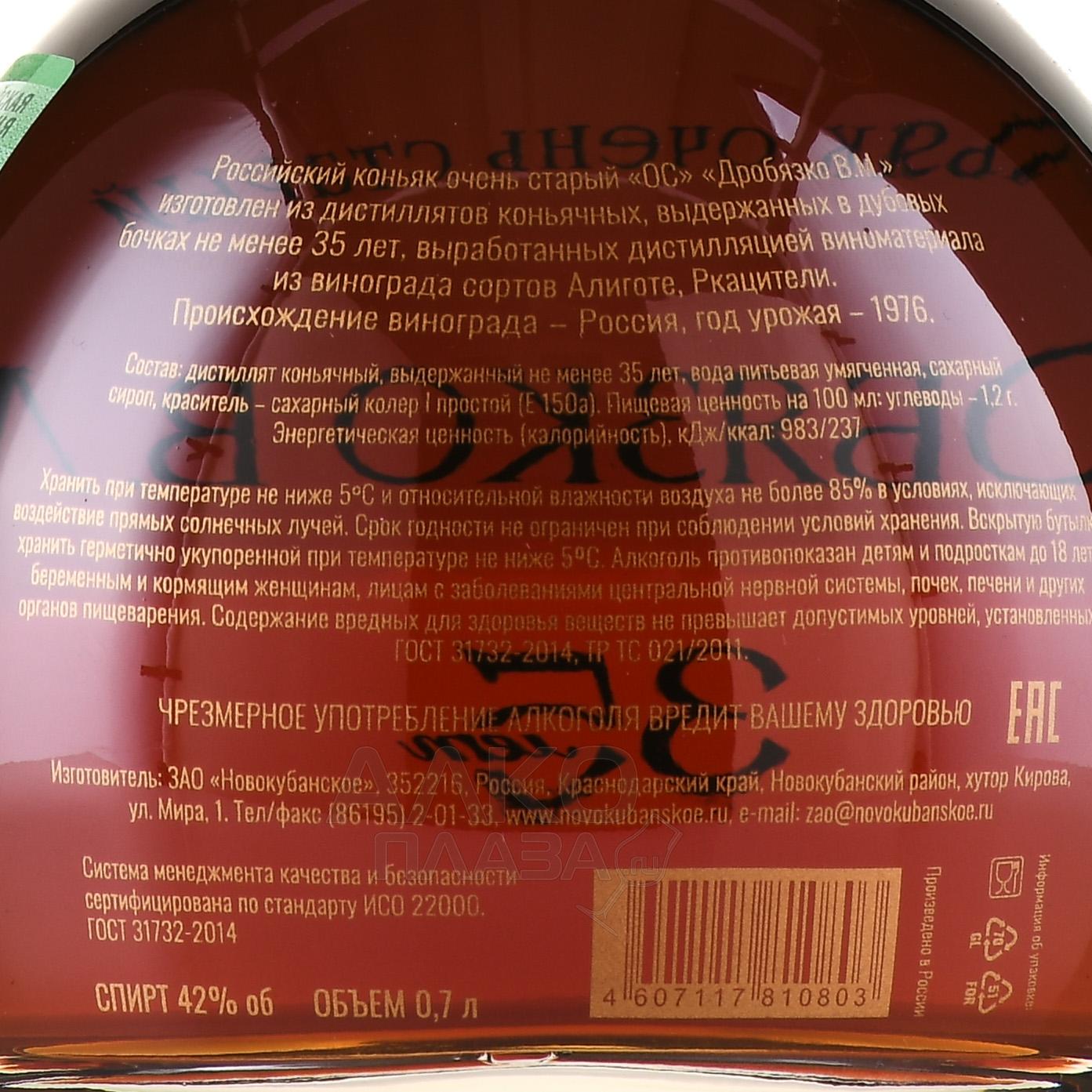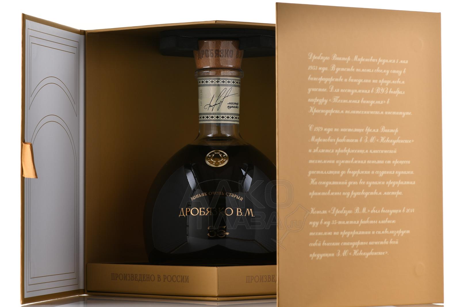 Коньяк ОС В. М. Дробязко 35 лет 0,7 л в п/у относится к категории особо старых выдержанных напитков российского производства. Купаж создан на основе виноградных дистиллятов, полученных из европейского и грузинского сортов винограда, ягоды которых собрали на юге России. После ферментации молодое вино перегнали, а затем — выдержали на протяжении трёх с половиной десятилетий в дубовых бочках. Длительный контакт с древесиной способствовал формированию сложной структуры, устойчивого цвета и многослойного аромата. Купажирование провели после выдержки для сохранения стилевого баланса. Сувенирная коробка подчёркивает коллекционный характер релиза, названного в честь главного технолога Новокубанского коньячного завода Виктора Мироновича Дробязко, участвовавшего в создании напитка.