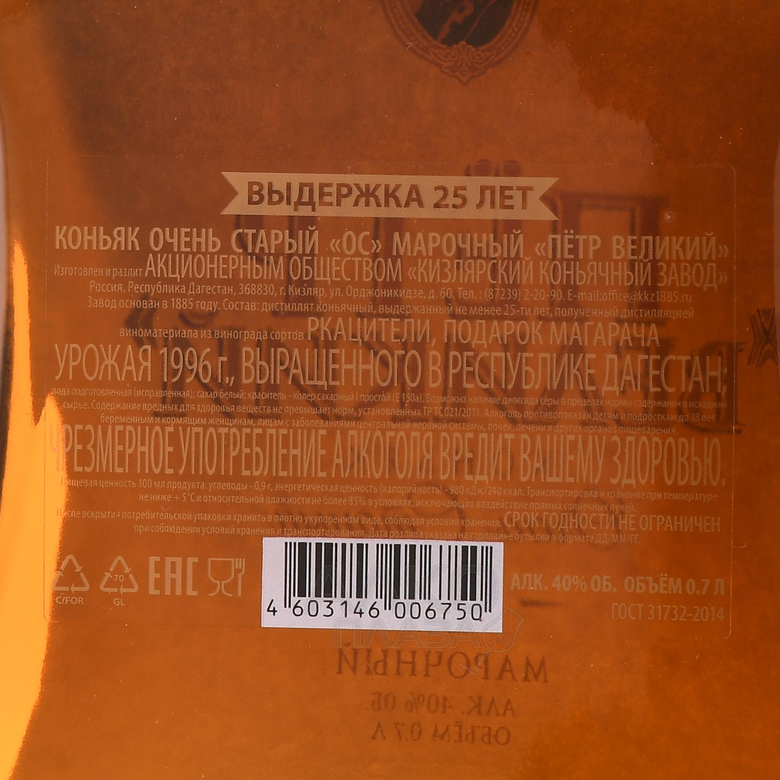 Коньяк Петр Великий ОС 25 лет 0,7 л в декантере и п/у – это выдержанный напиток на основе винограда сортов Ркацители и Подарок Магарача, выращенного в Дагестане. Здесь виноградники занимают солнечные склоны у предгорий, где перепады температур между днем и ночью способствуют накоплению аромата и сохранению кислотности. Почвы преимущественно аллювиальные и глинистые, что дает ягодам сбалансированную структуру. Урожай собирают вручную, после чего ягоды прессуют, а сок — сбраживают и дважды перегоняют, после чего долго выдерживают в дубовых бочках. Четверть века нахождения дистиллятов в древесине формирует сложный вкус, насыщенный аромат и бархатистую текстуру. Элегантный графин в комплекте с подарочной упаковкой подчеркивает статус купажа и делает его достойным выбором для ценителей редкого марочного алкоголя.