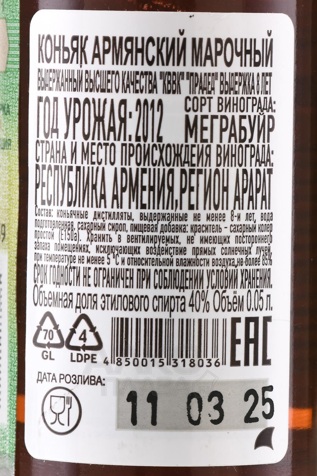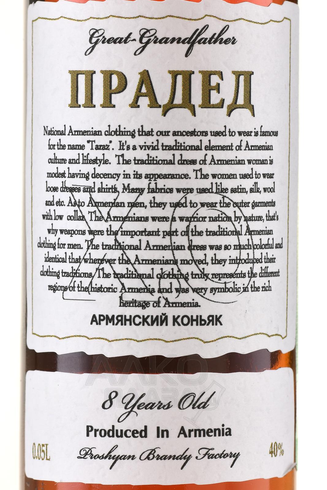 Коньяк Прадед 8 лет 0.05 л был выдержан в бочках, изготовленных вручную из кавказского дуба, придававших напитку уникальный бархатистый характер. Виноград для него собирался вручную в долине реки Аракс, известной мягким климатом, богатой вулканической почвой и идеальными условиями для созревания сочных, ароматных ягод. Особенностью технологии стало двойное медленное дистиллирование в медных аламбиках с последующей выдержкой в старинных подвалах, где благодаря естественным условиям алкоголь приобретал глубокий и гармоничный букет.