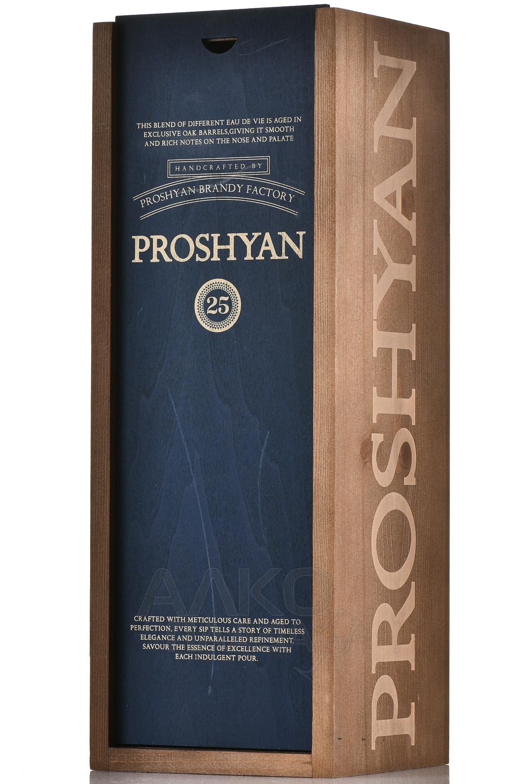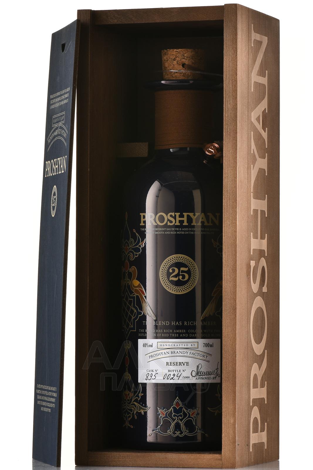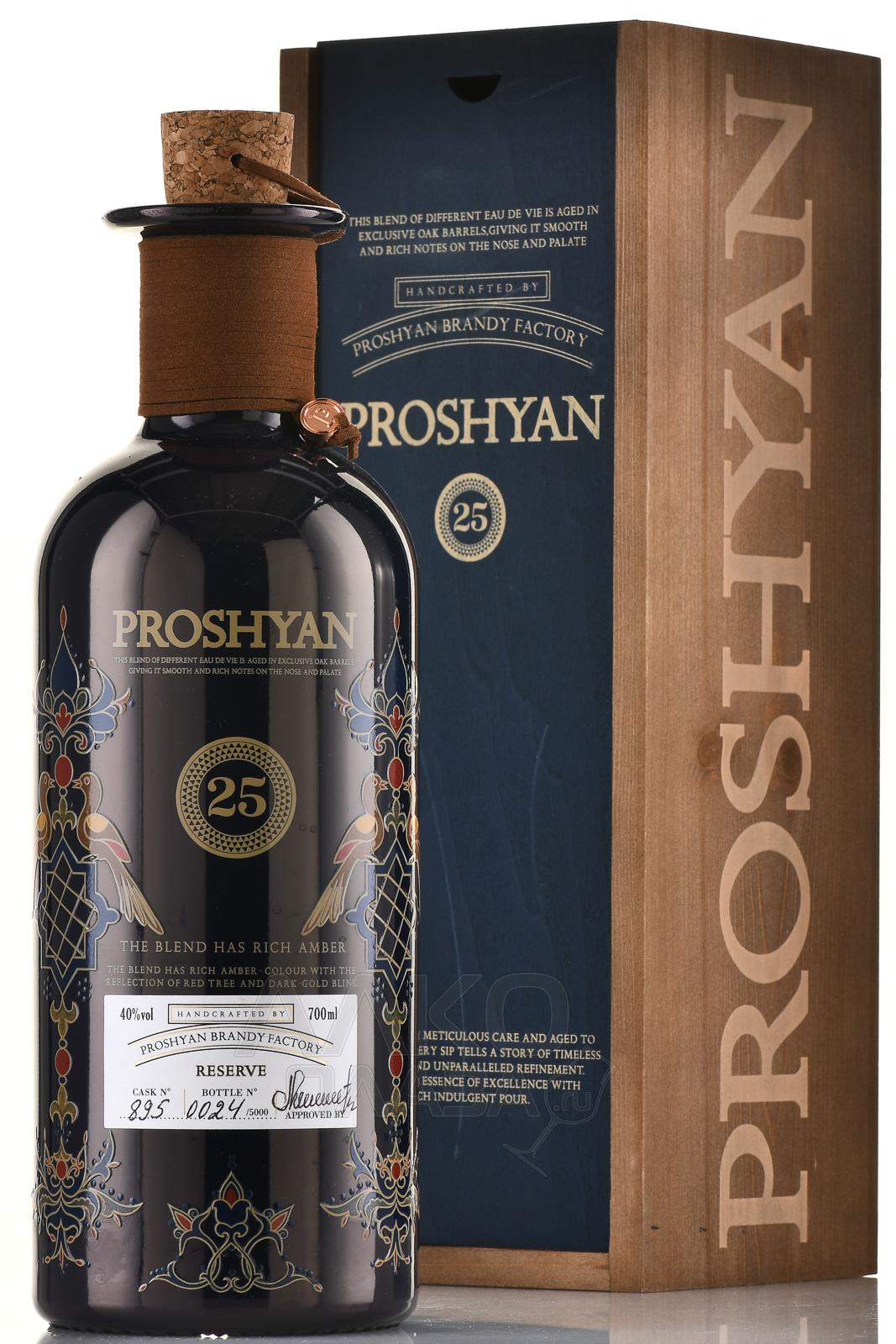 Коньяк Прошян Резерв 25 лет 0,75 л в п/у дерево — премиальный армянский образец крепкого спиртного, выдержанный четверть века в дубе. Напиток изготовлен на Прошянском коньячном заводе, известном традиционными технологиями и строгим контролем качества на каждом этапе производства. Сырьем служит виноград, выращенный в уникальном климате высокогорного региона Арагоцтн, где сочетание жаркого солнца и прохладных ночей идеально подходит для развития ягод с насыщенным ароматом и сладостью. Дистилляция проходила в медных аламбиках, затем спирты минимум 25 лет выдерживали в бочках из черного кавказского дуба. Элитная деревянная упаковка подчеркивает статус купажа, делая его подходящим как для подарка, так и для пополнения домашней коллекции марочного алкоголя.