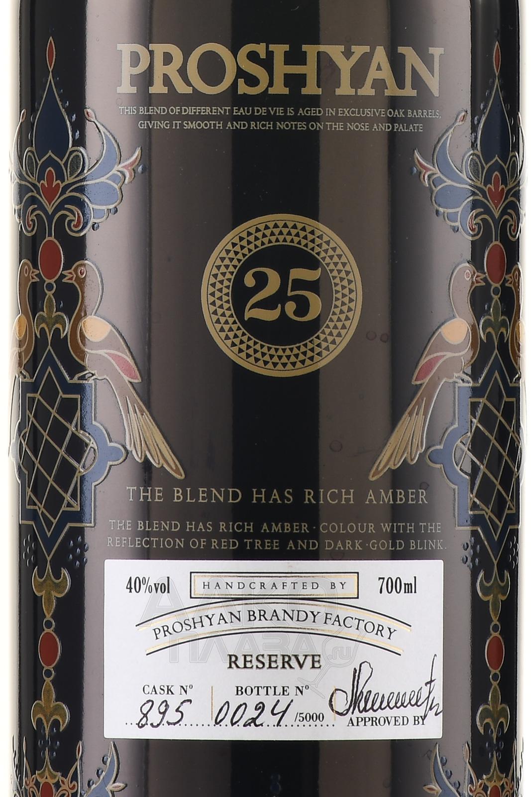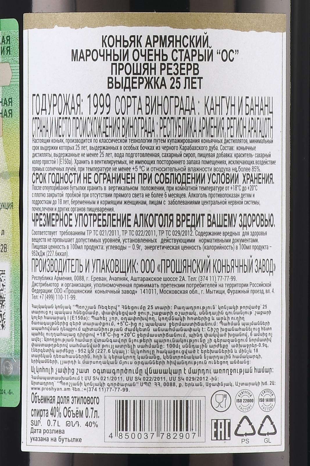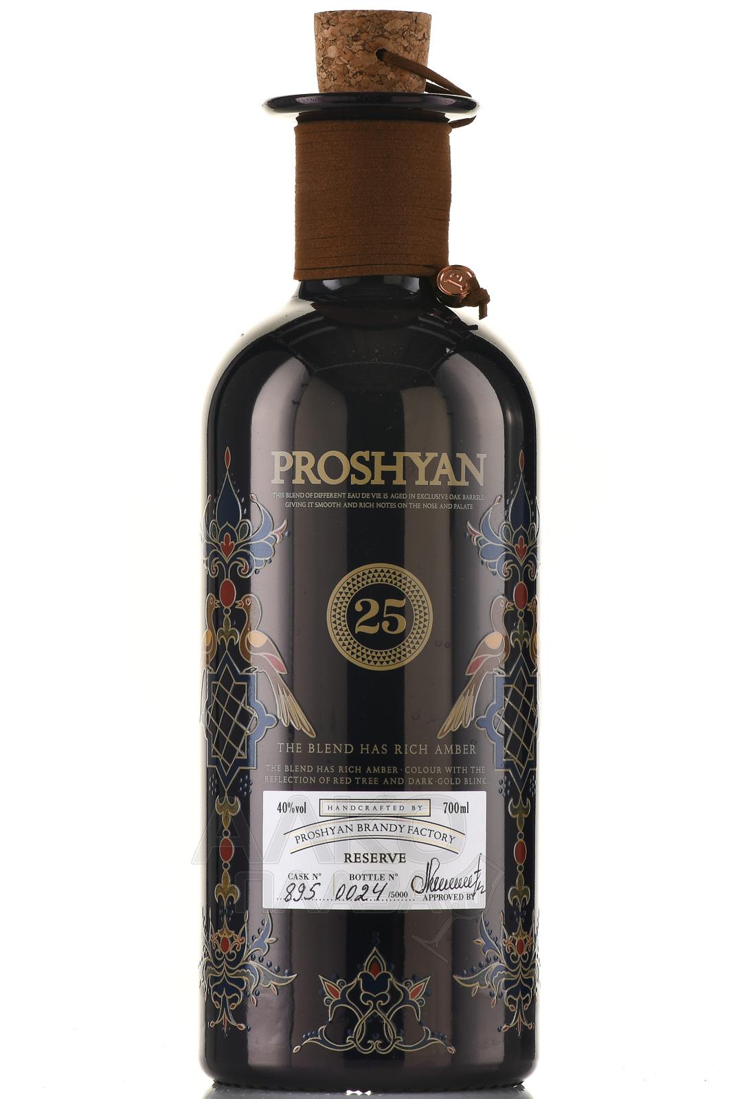 Коньяк Прошян Резерв 25 лет 0,75 л в п/у дерево — премиальный армянский образец крепкого спиртного, выдержанный четверть века в дубе. Напиток изготовлен на Прошянском коньячном заводе, известном традиционными технологиями и строгим контролем качества на каждом этапе производства. Сырьем служит виноград, выращенный в уникальном климате высокогорного региона Арагоцтн, где сочетание жаркого солнца и прохладных ночей идеально подходит для развития ягод с насыщенным ароматом и сладостью. Дистилляция проходила в медных аламбиках, затем спирты минимум 25 лет выдерживали в бочках из черного кавказского дуба. Элитная деревянная упаковка подчеркивает статус купажа, делая его подходящим как для подарка, так и для пополнения домашней коллекции марочного алкоголя.