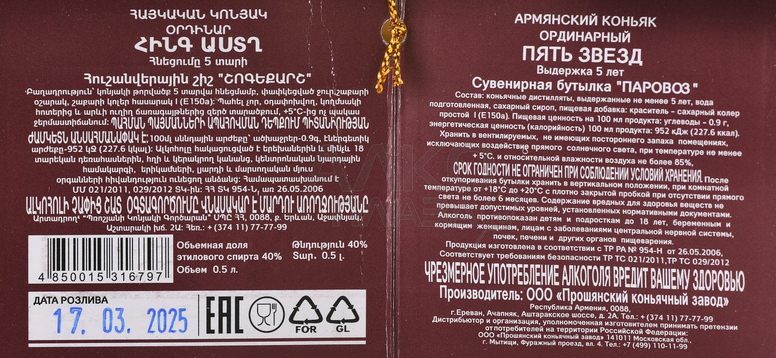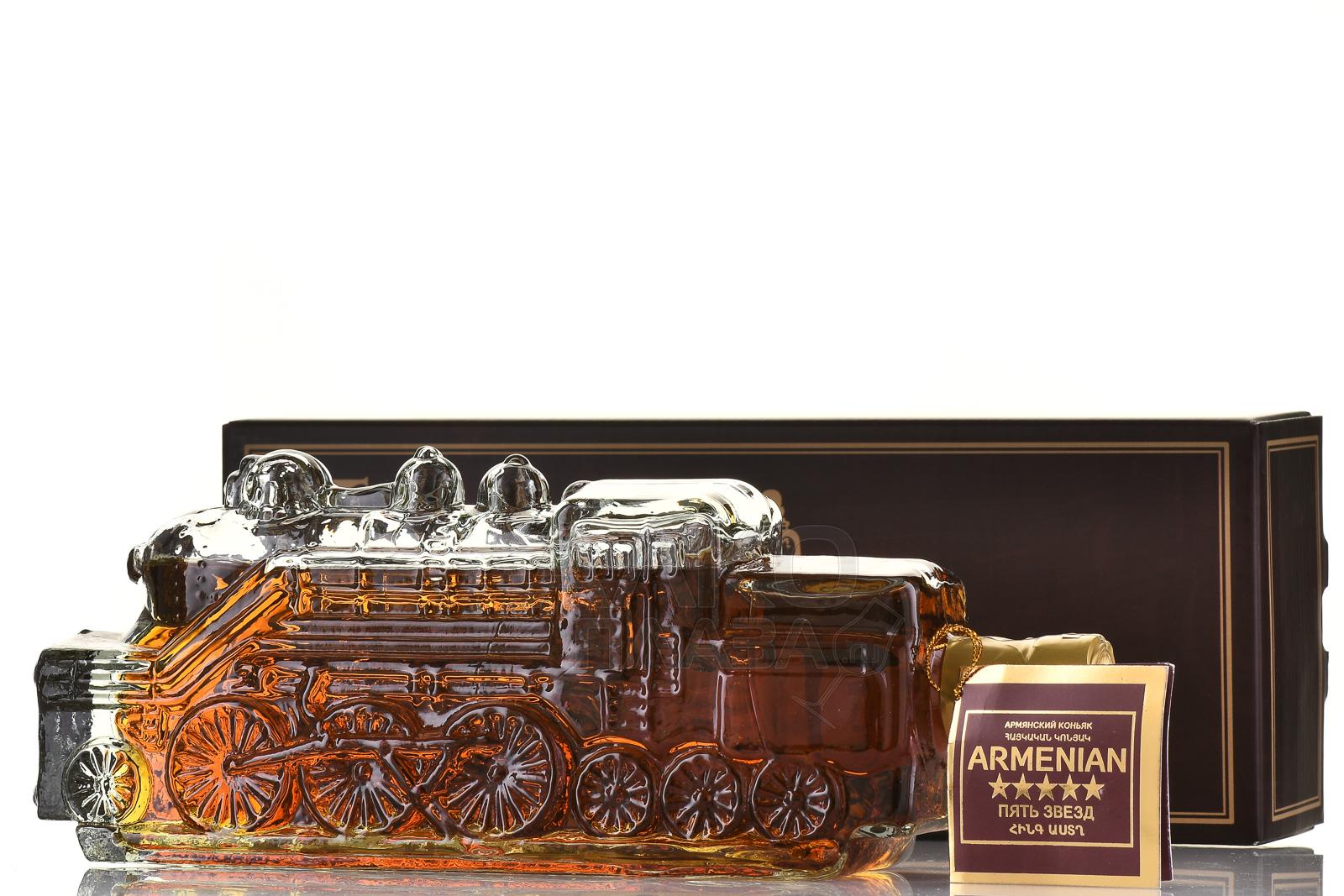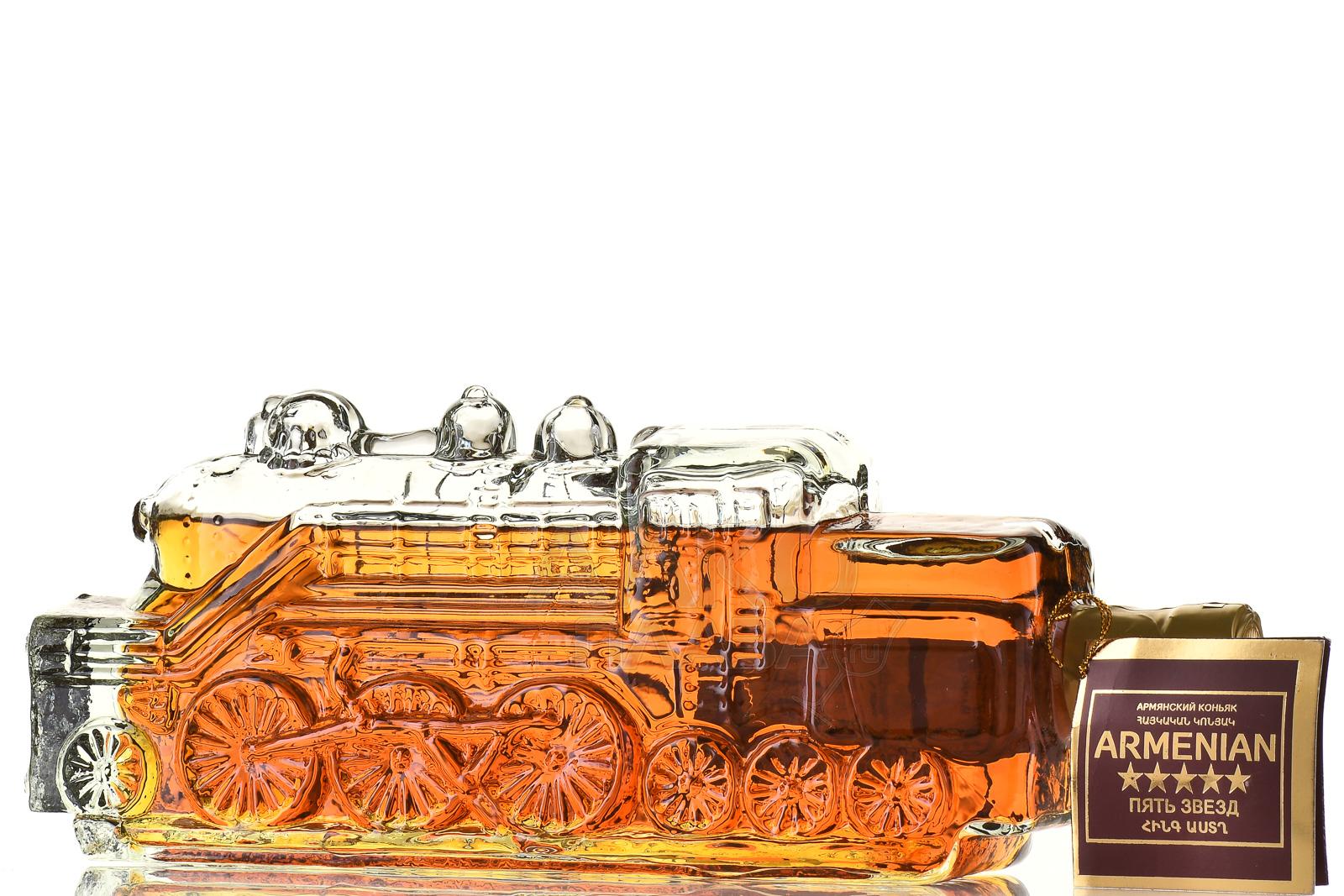 Коньяк Пять звезд 5 лет Паровоз сувенирная бутылка 0.5 л п/у был создан с особым вниманием к деталям, воплощая эстетику винокуренного искусства и коллекционную привлекательность. Дистилляция проводилась традиционным методом двойной перегонки, а выдержка коньячных спиртов в дубовых бочках длилась не менее пяти лет, что обеспечило насыщенность и гармонию напитка. Уникальная сувенирная бутылка в виде паровоза изготовлялась вручную из специального стекла, подчёркивая эксклюзивность продукта.