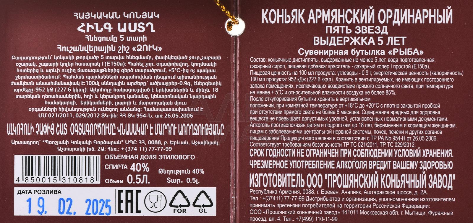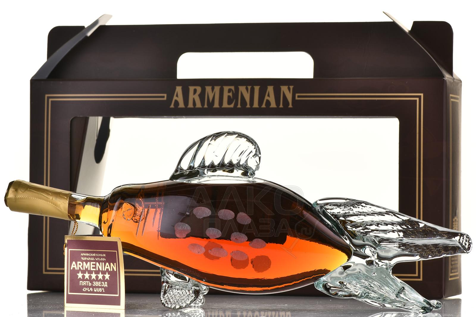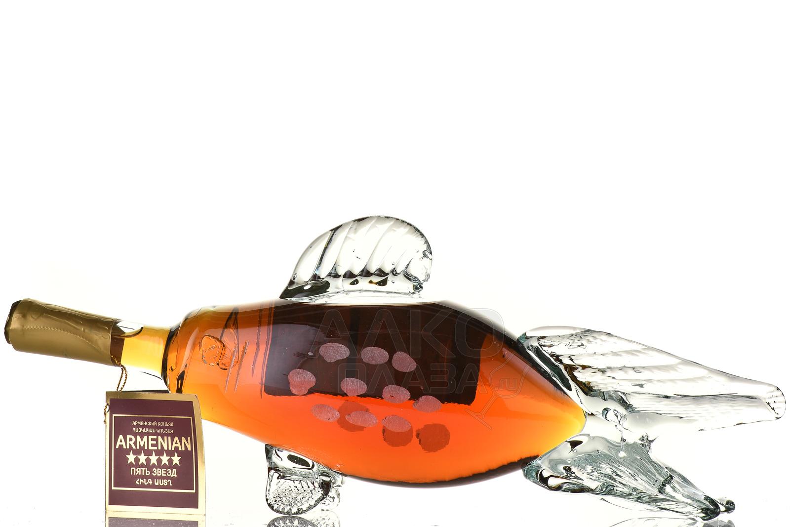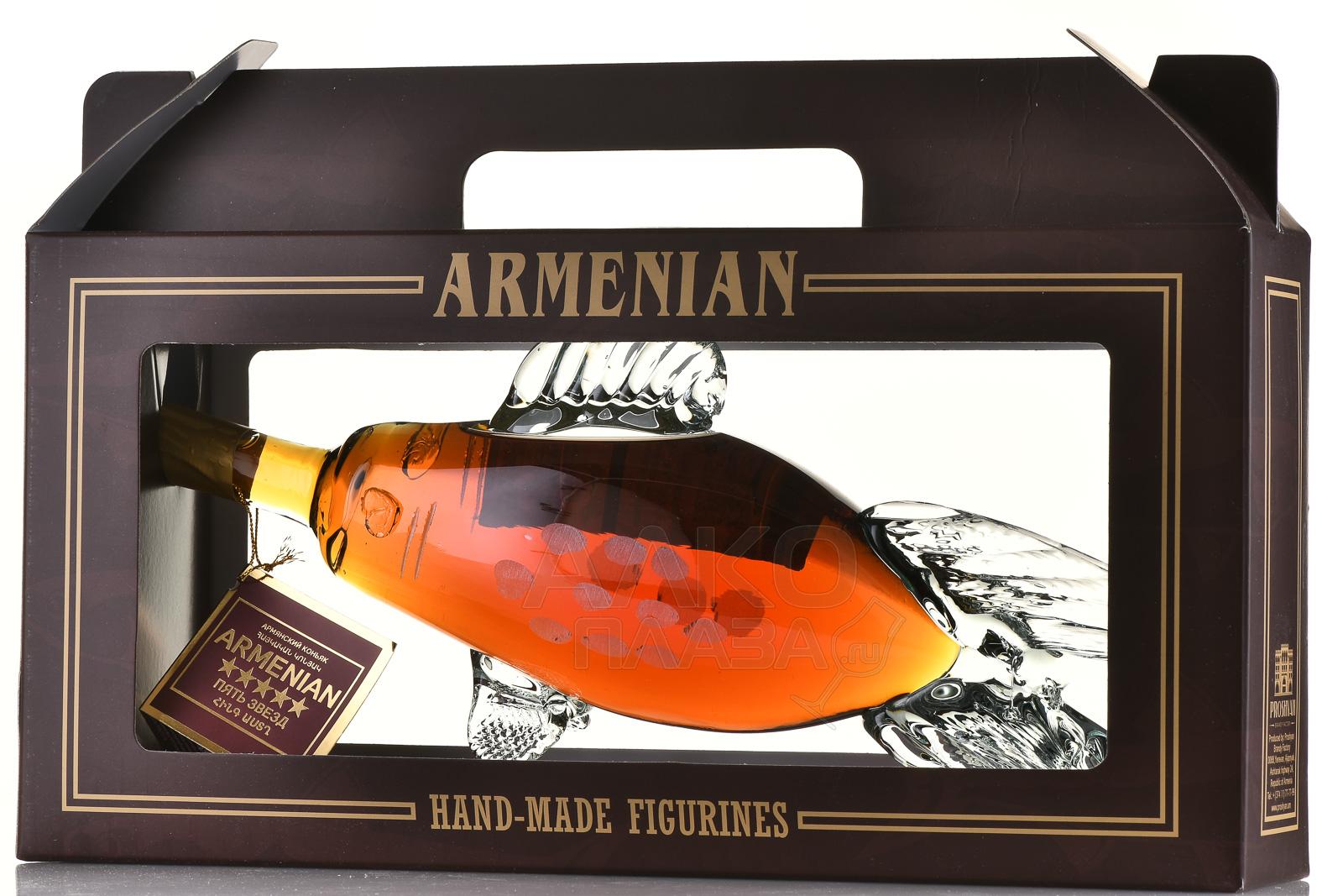 Коньяк Пять звезд 5 лет Рыба сувенирная бутылка 0,5 л п/у — красиво оформленный армянский алкоголь от Прошянского коньячного завода. Внимание привлекают эффектная стеклянная фигурная тара, выполненная с тщательной детализацией, и подарочный бокс. В оригинальном дизайне представлен один из самых популярных сортов — 5-летний, отличающийся мягким и гармоничным вкусом, длительным и теплым послевкусием. Такой коньяк станет отличным подарком заядлому рыболову, коллекционеру и работнику промышленной сферы, связанной с ловлей и переработкой рыбы. Сувенирная бутылка украсит собой праздничный стол и интерьер.