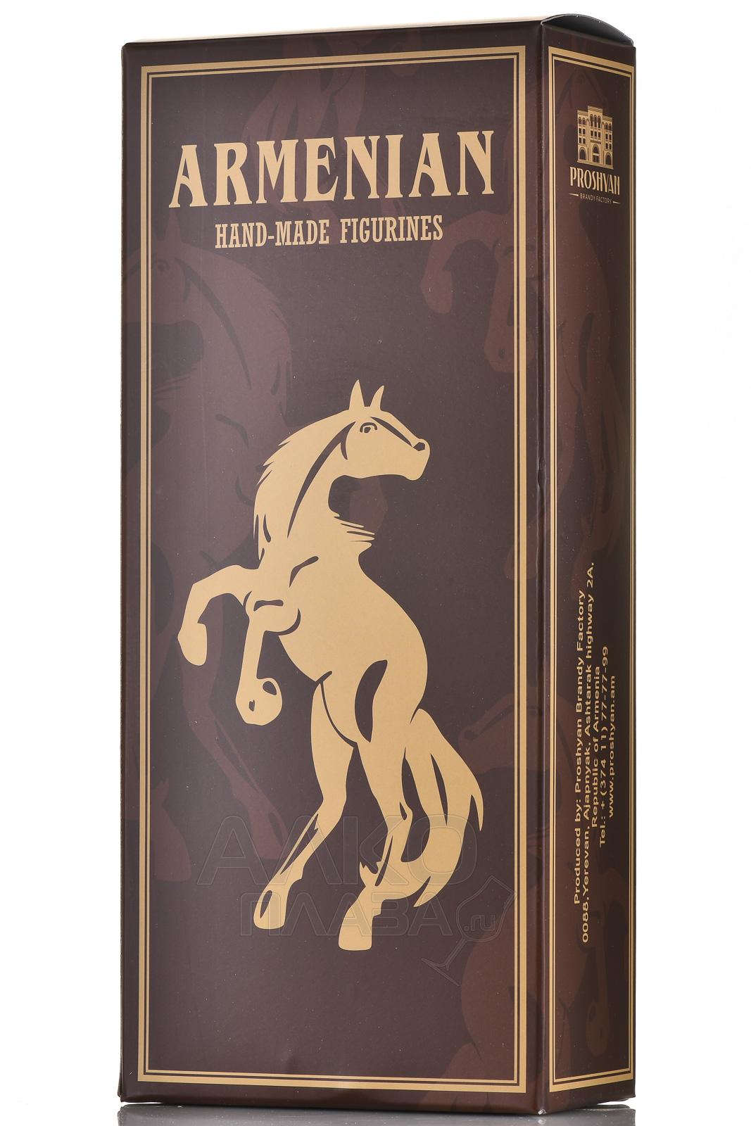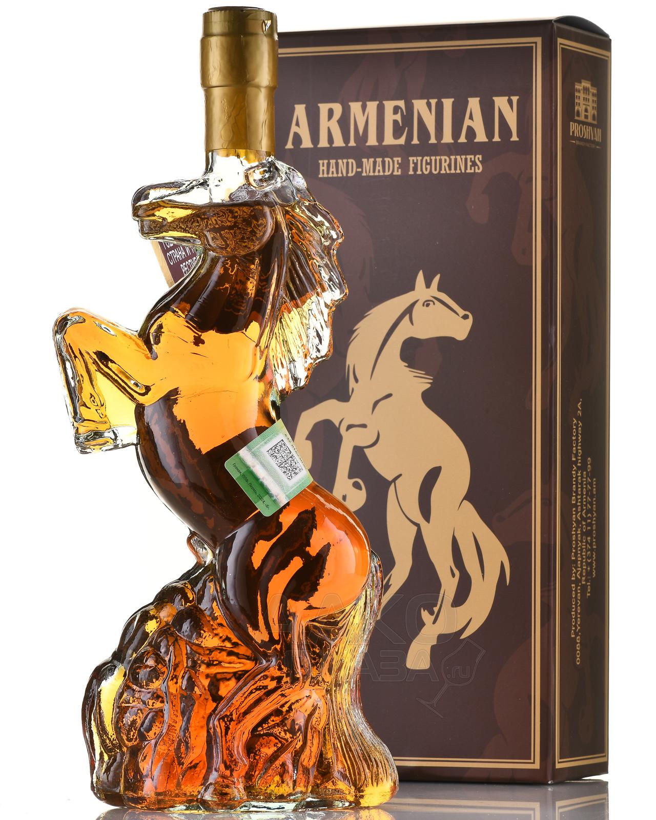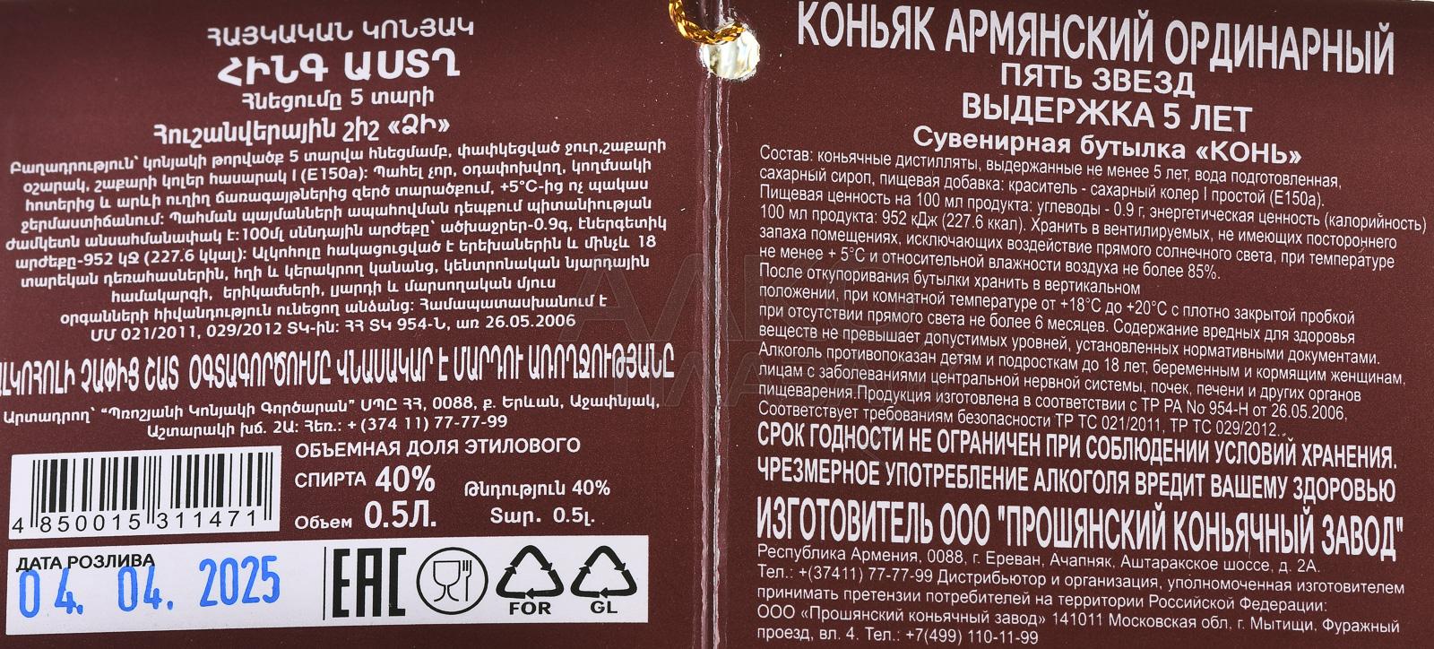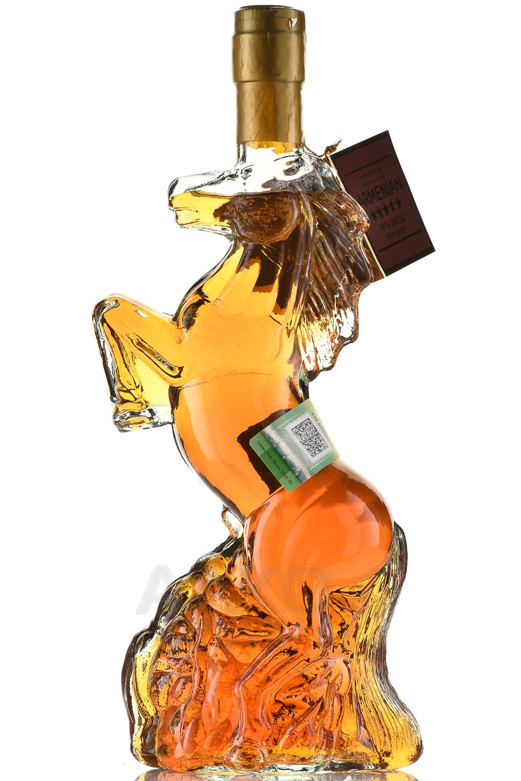 Коньяк Пять звезд 5 лет в сувенирной бутылке Конь 0,5 л в п/у – это армянский выдержанный бренди, представленный в оригинальной стеклянной бутылке в виде конской фигуры. Напиток изготовлен из качественных виноградных спиртов, произведённых по традиционной технологии двойной перегонки. Сырьём служит белый виноград популярных в Армении сортов. Коньячные дистилляты выдержали в дубовых бочках не менее пяти лет, благодаря чему они приобрели мягкость, глубокий вкус и золотисто-янтарный оттенок.