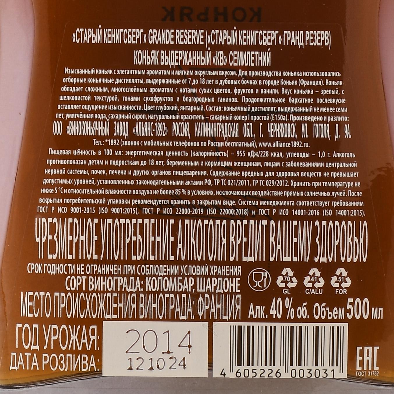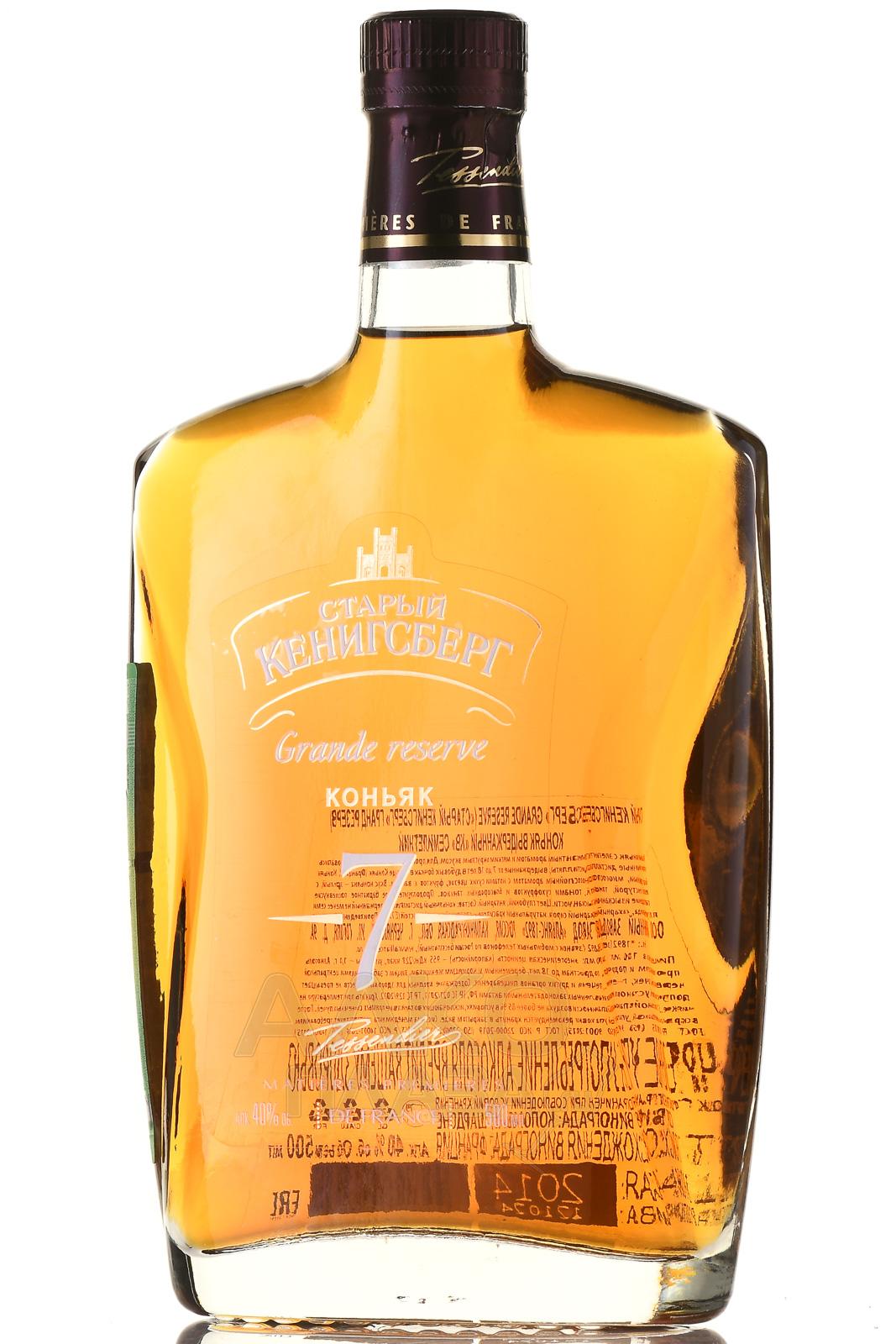 Коньяк Старый Кенигсберг Гранд Резерв 7 лет 0,5 л в декантере — выдержанный напиток российского производства. Выпускает его Винно-коньячный завод Альянс-1892 в Калининградской области. Образец отличается выраженным характером. Основой для него служат спирты, отобранные после выдержки в дубовых бочках. В производстве используется купажирование, чтобы добиться баланса между мягкостью и выразительностью. Дистилляты изготовили путём перегонки белого сухого вина из популярных французских сортов винограда. Выдержка до смешивания также проводилась во Франции, в регионе Коньяк, и длилась от 7 до 18 лет.