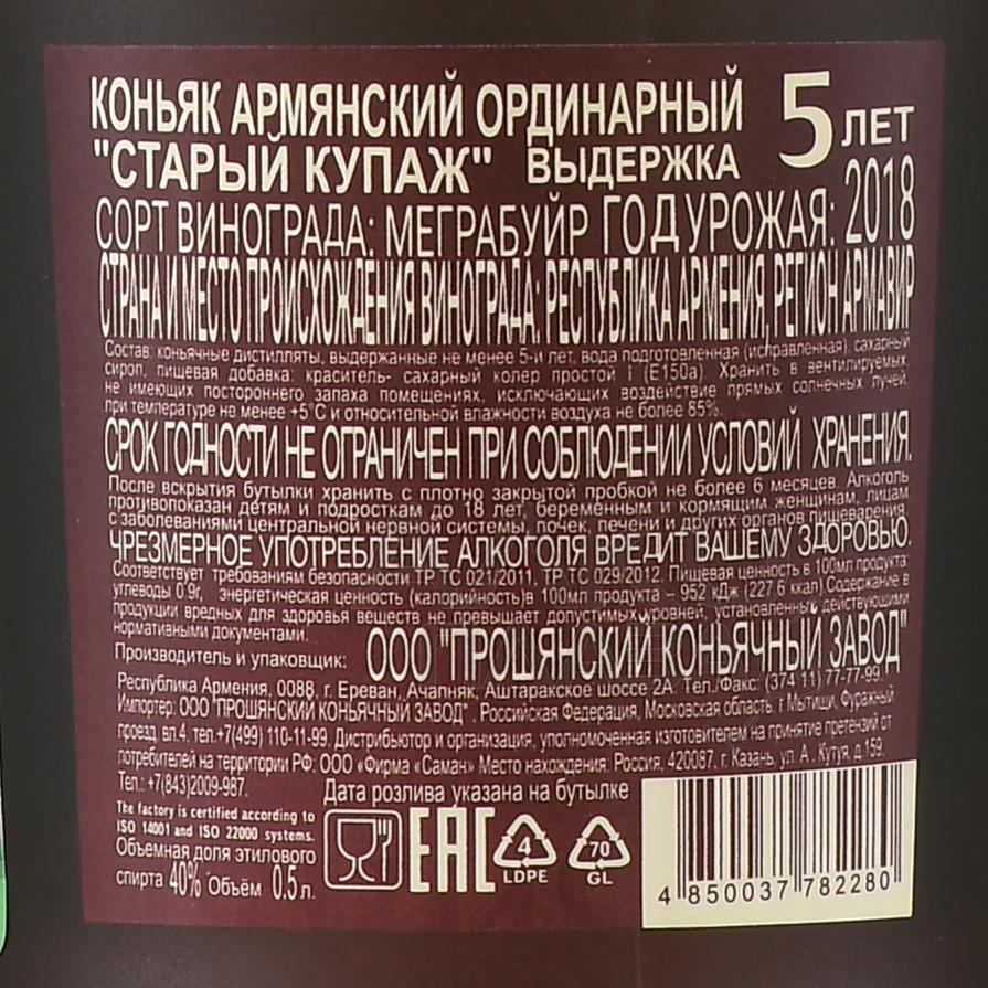 Коньяк Старый Купаж 5 лет 0,5 л создан на основе автохтонного армянского сорта винограда. Урожай для производства напитка собирается вручную на территории Араратской долины. Этот регион характеризуется континентальным климатом: зимы здесь морозные, с температурой до −20 °C, а лето жаркое, до +40 °C. Ягоды созревают в сентябре-октябре при накоплении сахара от 18 до 20%. Спирты получают двойной перегонкой белого вина, без длительной мацерации ягод. Затем следует выдержка на протяжении пяти лет в бочках из кавказского дуба.