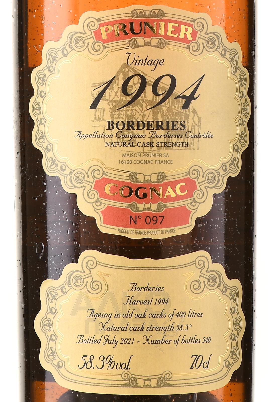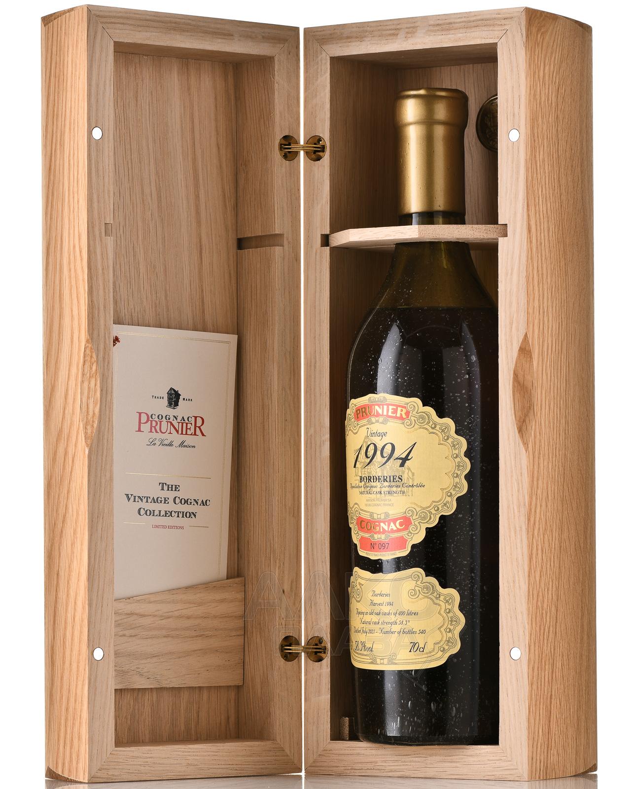 Коньяк Prunier Borderies Vintage 1994 г. 0,7 л в д/у — редкий коллекционный напиток, произведённый в одном из самых маленьких и престижных субрегионов Коньяка — Бордери. Виноград вырастили на глинисто-известняковых участках. Собранные при оптимальной спелости ягоды отжали, а полученный сок сбродили до состояния сухого вина, которое перегнали в традиционных медных кубах ёмкостью до 25 гектолитров с последующей выдержкой в дубовых бочках объёмом 350 литров. Особенность винтажа — ограниченный тираж: в год выпускается меньше тысячи бутылок, разлитых и пронумерованных вручную. Выдержка образца составляет не менее 25 лет, благодаря чему он имеет глубокий, сложный вкус и тонкий ароматический букет.
