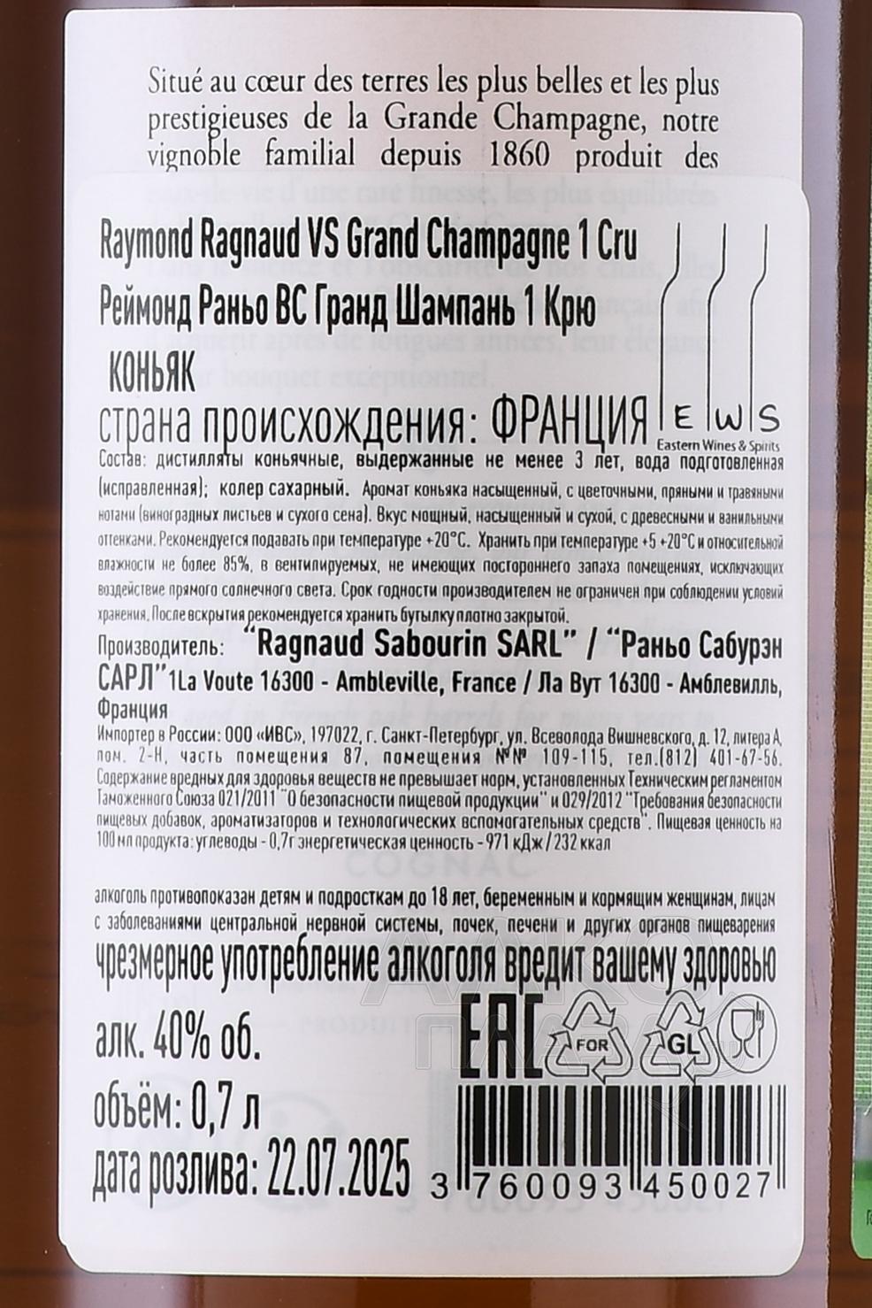 Raymond Ragnaud VS Premier Cru Grande Champagne - коньяк Реймонд Раньо ВС Гранд Шампань Премье Крю 0.7 л в п/у