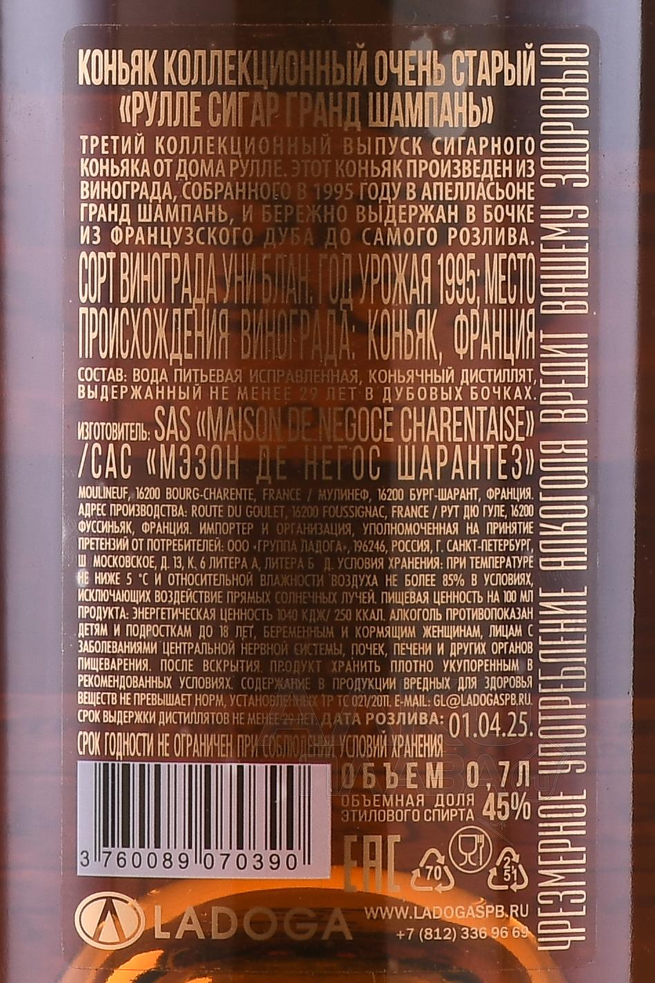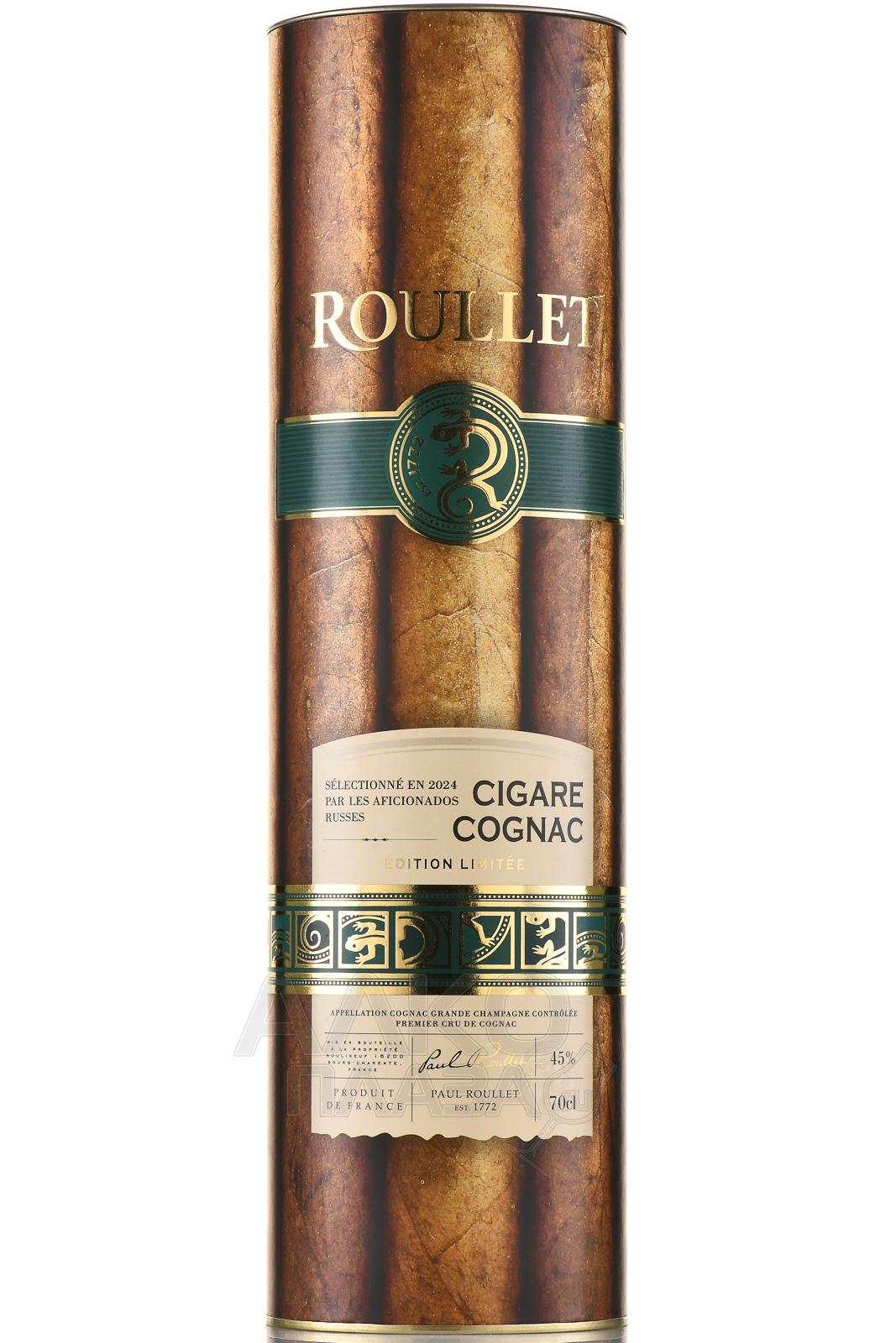 Коньяк Roullet Cigare 29 лет 0,7 л в тубе – третий релиз, выпущенный по спецзаказу представителей российского сигарного общества. Этот юбилейный выпуск, приуроченный к 250-летию основания коньячного дома Рулле. Ограниченный тираж — всего 999 бутылок (каждая пронумерована). Основой стали дистилляты Гранд Шампань из урожая 1995 года, выдерживавшиеся в дубовых французских бочках до самого розлива (состоялся в апреле 2025 года). Этот коллекционный эксклюзивный коньяк предназначен для дегустации как дижестив в сопровождении дорогой сигары. Его можно преподнести как редкий подарок ценителю элитного алкоголя и витол.