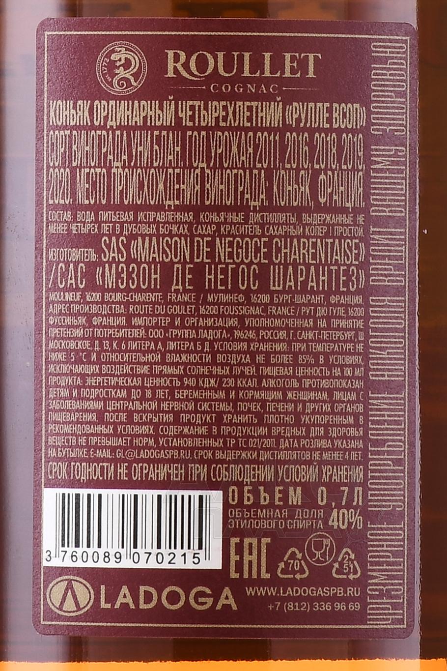 Коньяк Roullet VSOP является контролируемым по месту происхождения, т. к. его разрешено производить только в области Коньяк на территории Франции. Натуральный 40-процентный напиток, содержащий в основе сочный виноград автохтонной вариации, произведен по классическому алгоритму, подразумевающему ферментацию, перегонку и выдержку сусла в дубовых бочках на протяжении как минимум 4 лет.