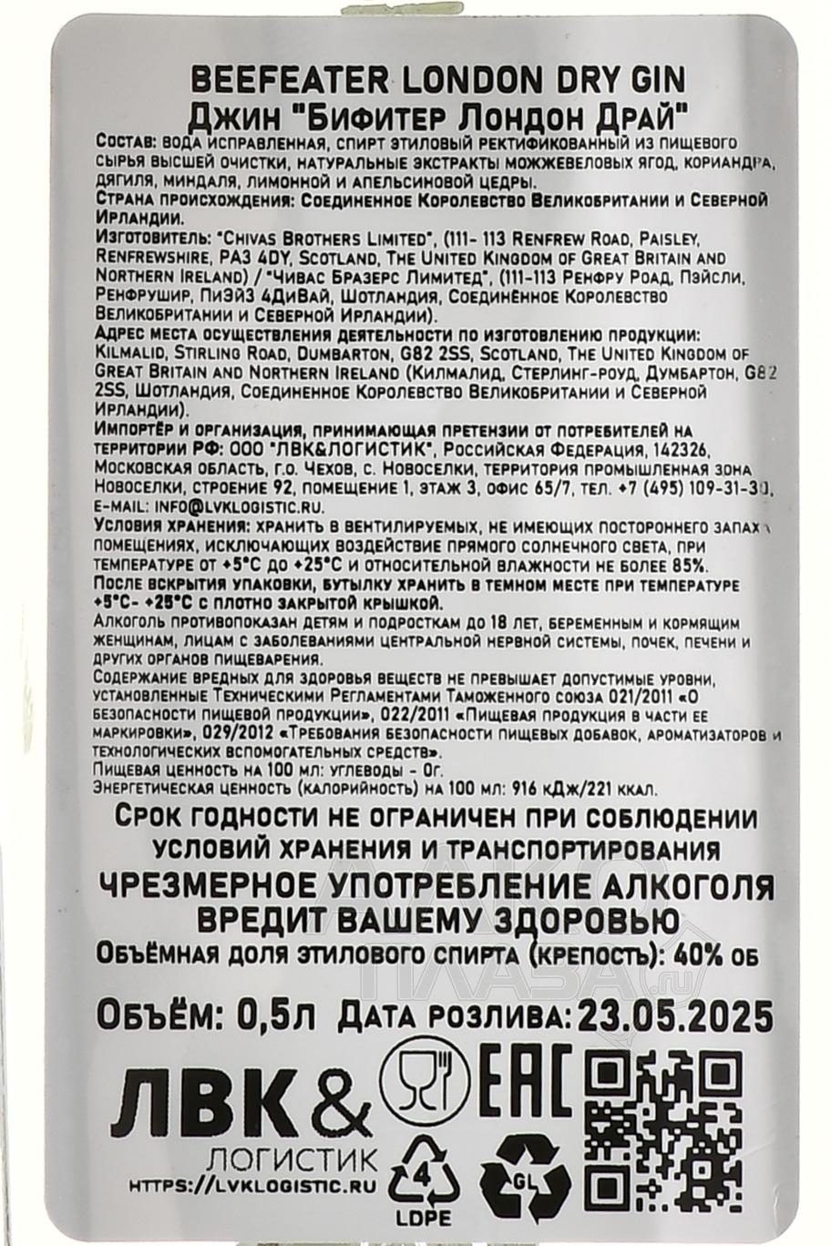 Beefeater London Dry - джин Бифитер Лондон Драй 0.5 л