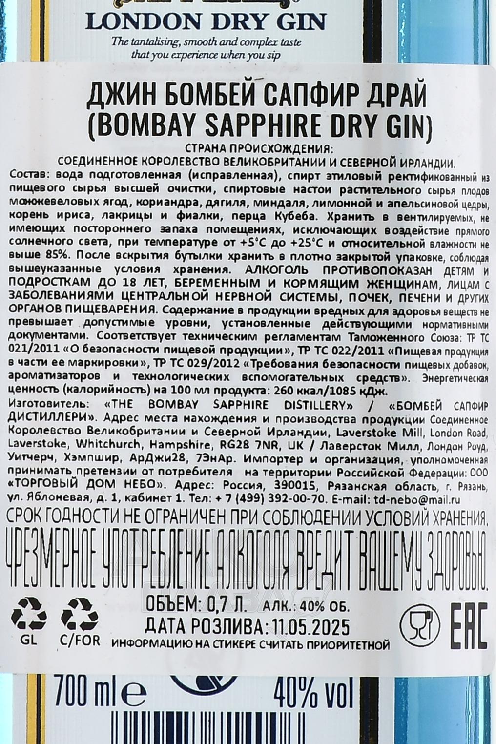 Джин Bombay Sapphire 0,7 л отличается своим узнаваемым стилем и уникальным методом производства. В его основе лежит рецепт с десятью ботаническими ингредиентами, собранными в разных регионах мира: можжевельник из Италии, кориандр из Марокко, лимонная цедра из Испании, лакрица из Китая и другие ингредиенты. Главная особенность напитка — метод паровой инфузии. Вместо прямой перегонки растения помещают в специальные корзины, и пары спирта насыщаются их ароматами, что делает вкус более мягким и многослойным. Производство ведётся на винокурне Laverstoke Mill в графстве Хэмпшир, где сочетаются исторические традиции и современный подход. Бренд уделяет внимание устойчивому развитию, используя экологичные технологии. Благодаря этому напиток остаётся неизменно чистым, лёгким и гармоничным.