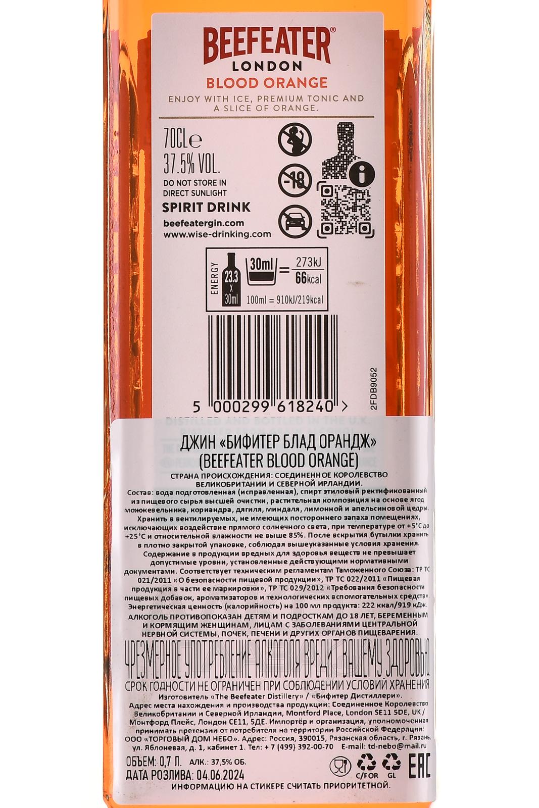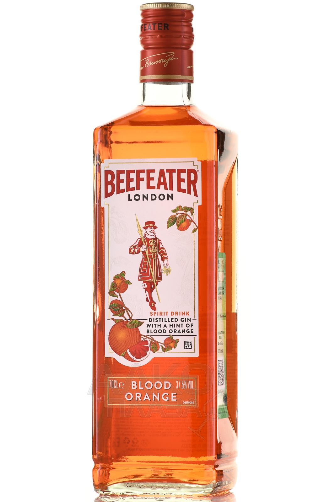 Gin Beefeater Blood Orange — при производстве этого джина используется классичекий "Бифитер" Лондон Драй и экстракт апельси на. В результате получился напиток яркого цвета, свежего аромата с оттенками апельсина и можжевельника. Вкус обладает лёгкой сладостью, приятной горчинкой, освежающей можжевеловой нотой. Джин прекрасно подходит для употребления в чистом виде, а так же для приготовления коктейлей.