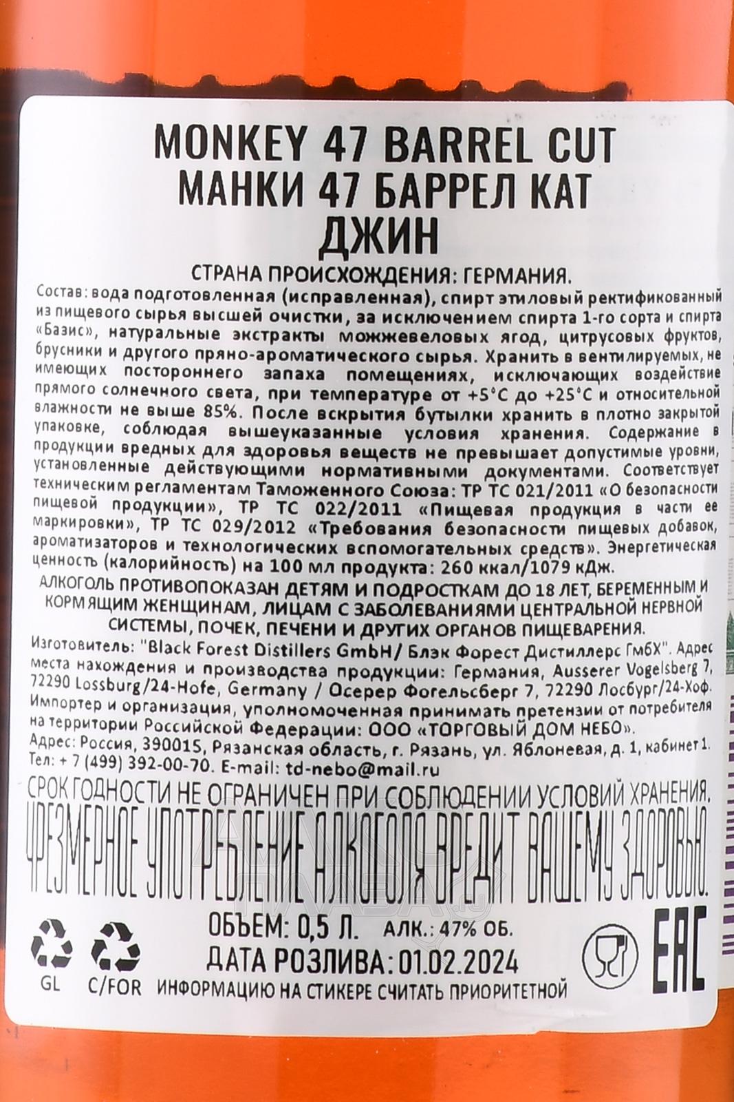 Джин Monkey 47 Barrel Cut Schwarzwald Dry Gin 0,5 л в п/у производится в Шварцвальде, регионе Германии, где мягкий климат и лесные почвы формируют богатое разнообразие растений. В его основе — классический образец из 47 ботанических ингредиентов, среди которых хвоя, травы и цитрусы. Главная особенность версии Баррел Кат заключается в выдержке дистиллята в бочках из тутового дерева, изготовленных вручную. Это редкий материал, который придаёт напитку дополнительные ноты и подчёркивает глубину аромата. Сама выдержка длится несколько месяцев и проходит в условиях высокой влажности и стабильной температуры, характерных для подземных хранилищ региона. Купаж сохраняет свою яркую пряность, но приобретает мягкость и особую древесную окраску, что делает его уникальным в линейке бренда.