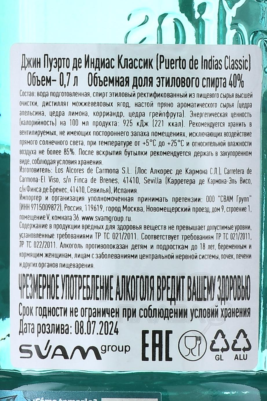 Джин Puerto de Indias Classic 0,7 л родом из Испании. Он создан в Севилье на основе старинных рецептов. Напиток производится андалузийской дистиллерией, сочетающей классические технологии перегонки и местные растительные ингредиенты. В состав входят можжевельник, цитрусовые и ароматные травы, что придаёт джину свежий и мягкий характер. Уникальность напитка заключается в его балансе: он сохраняет традиционную сухость, но при этом остаётся лёгким и универсальным. Марка Пуэрто де Индиас стала известной благодаря качеству и узнаваемому стилю, что позволило джину получить признание на международном уровне.
