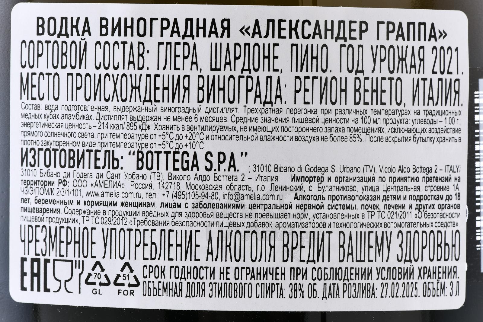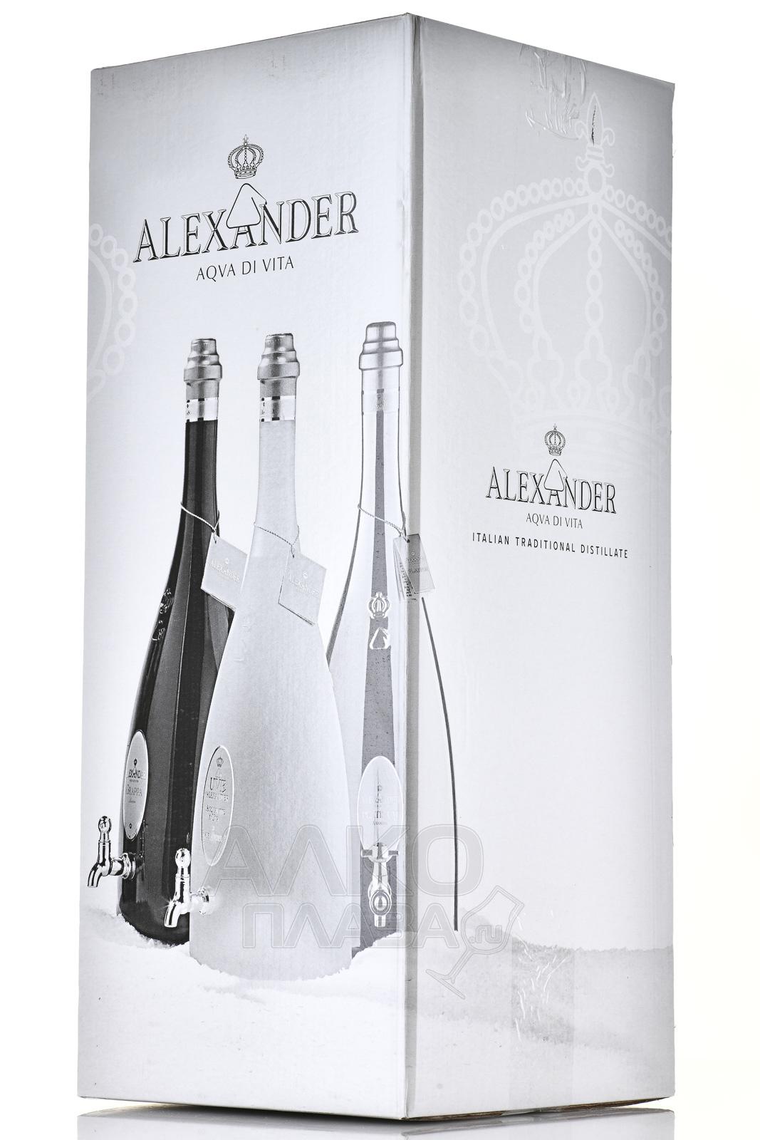 Граппа Alexander 3 л — итальянский дистиллят высокого качества, представленный в редком крупном объёме. Создаётся он методом перегонки виноградного жмыха, оставшегося после изготовления вина. Для изготовления напитка используют сырьё красных и белых сортов, в том числе традиционных для региона Венето, откуда родом этот бленд. Выжимки подвергают медленной паровой дистилляции в медных перегонных кубах. Процесс проходит при строго контролируемой температуре, чтобы сохранить яркие ароматы и вкусовые оттенки. В большой бутылке купаж дольше сохраняет свою органолептику, а презентабельный внешний вид превращает граппу в солидный коллекционный подарок.