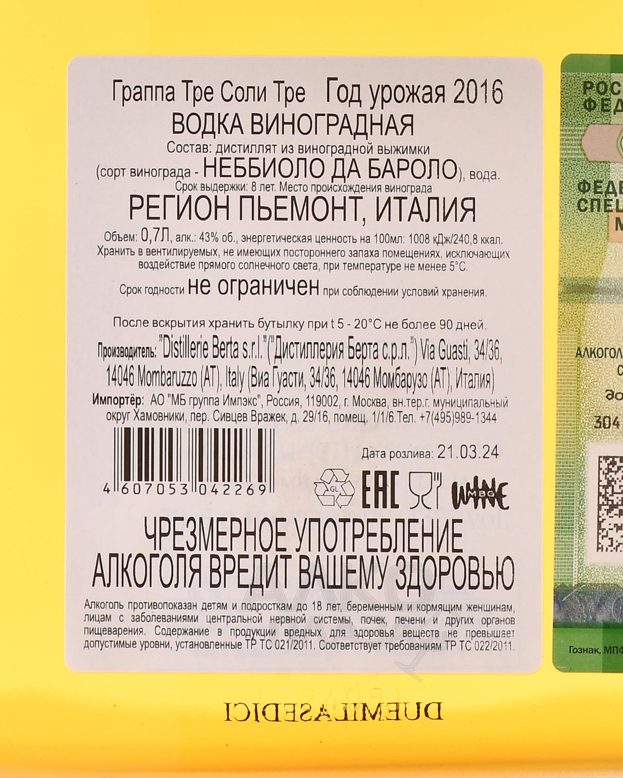 Berta Tre Soli Tre 8 years - граппа Берта Тре Соли Тре 8 лет 0.7 л в д/у