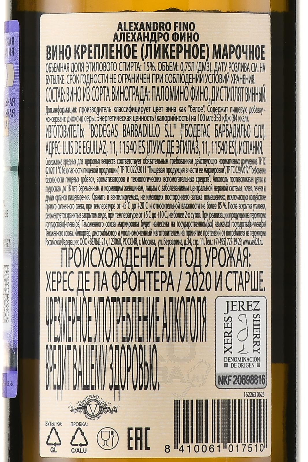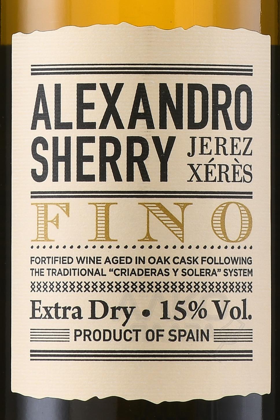 Херес Alexandro Fino 0,75 л представлен вариацией от уважаемого испанского производителя с большим опытом изготовления традиционных национальных напитков. Вино получено путем биологической выдержки – это означает, что созревание спиртного проходило под пленкой хересных дрожжей, которую называют флер или флор. Насыщенный профиль Фино ярко отражает один из популярных винных стилей Андалусии.