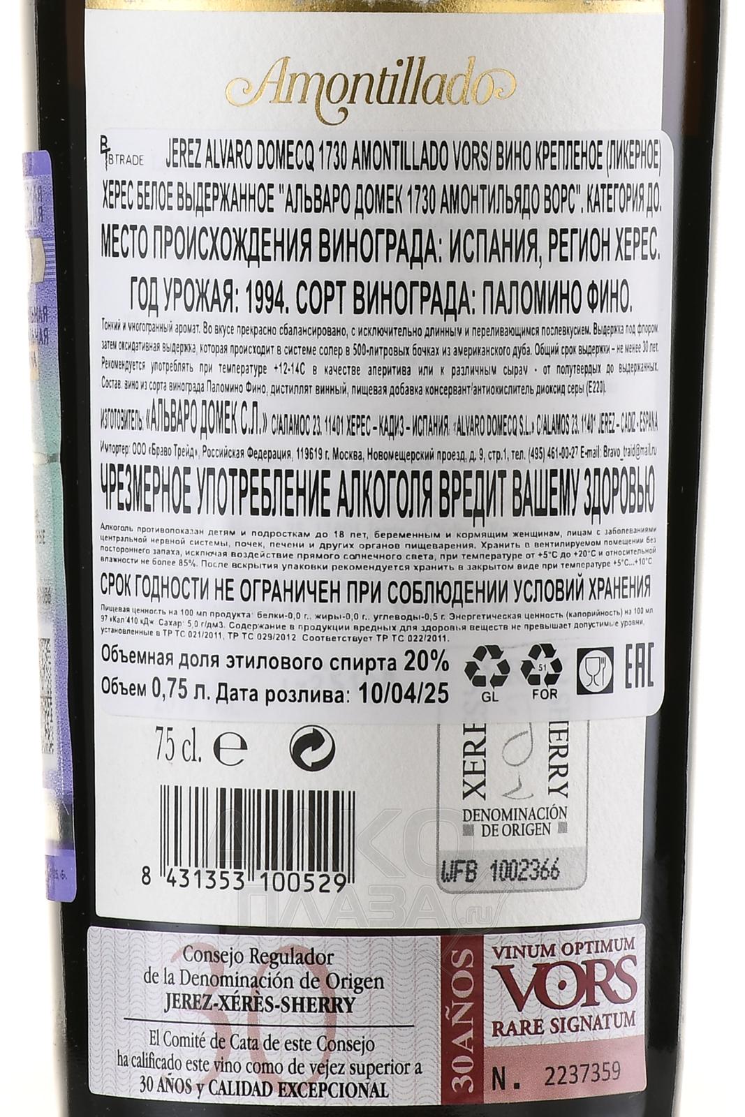 Alvaro Domecq 1730 Amontillado VORS - херес Альваро Домек 1730 Амонтильядо ВОРС 0.75 л в д/у