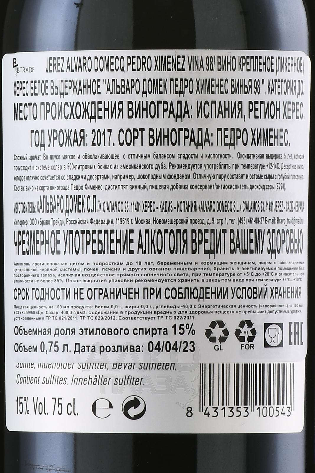 Alvaro Domecq Pedro Ximenez Vina 98 - херес Альваро Домек Педро Хименес Винья 98 0.75 л