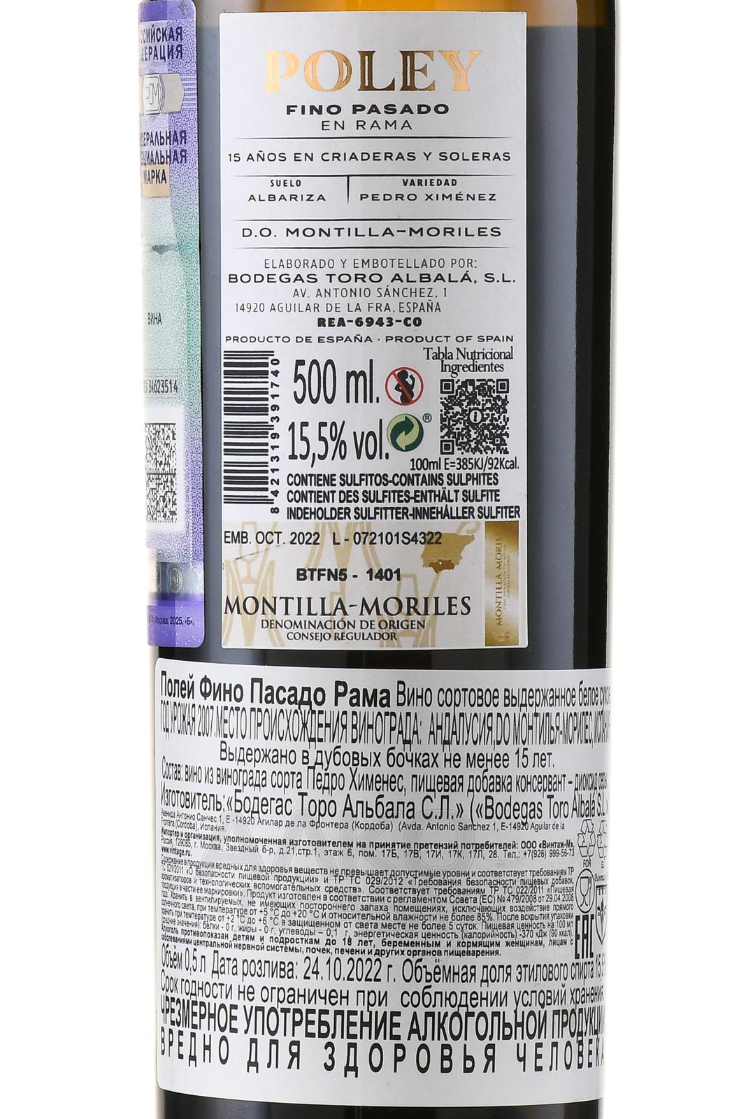 Белый сухой херес Poley Fino Fino Pasado Rama 15 лет 0,5 л производится в Андалусии, в зоне DO Montilla-Moriles, в хозяйстве Bodegas Toro Albalá. Виноградники региона расположены на почвах альбариса с высоким содержанием известняка. Эти светлые почвы отражают солнечный свет и удерживают влагу, что важно в жарком климате Кордовы. Основой служит Педро Хименес, традиционный для Montilla-Moriles сорт. Базовое вино получают методом полного сбраживания. Далее оно укрепляется спиртом и выдерживается под слоем флора по системе солера и криадера. Категория Пасадо указывает на более длительное старение под флором и частичное оксидативное развитие. Средний возраст вина около 15 лет. Обозначение Рама означает розлив без холодной фильтрации с минимальной обработкой для сохранения естественной текстуры и ароматики.