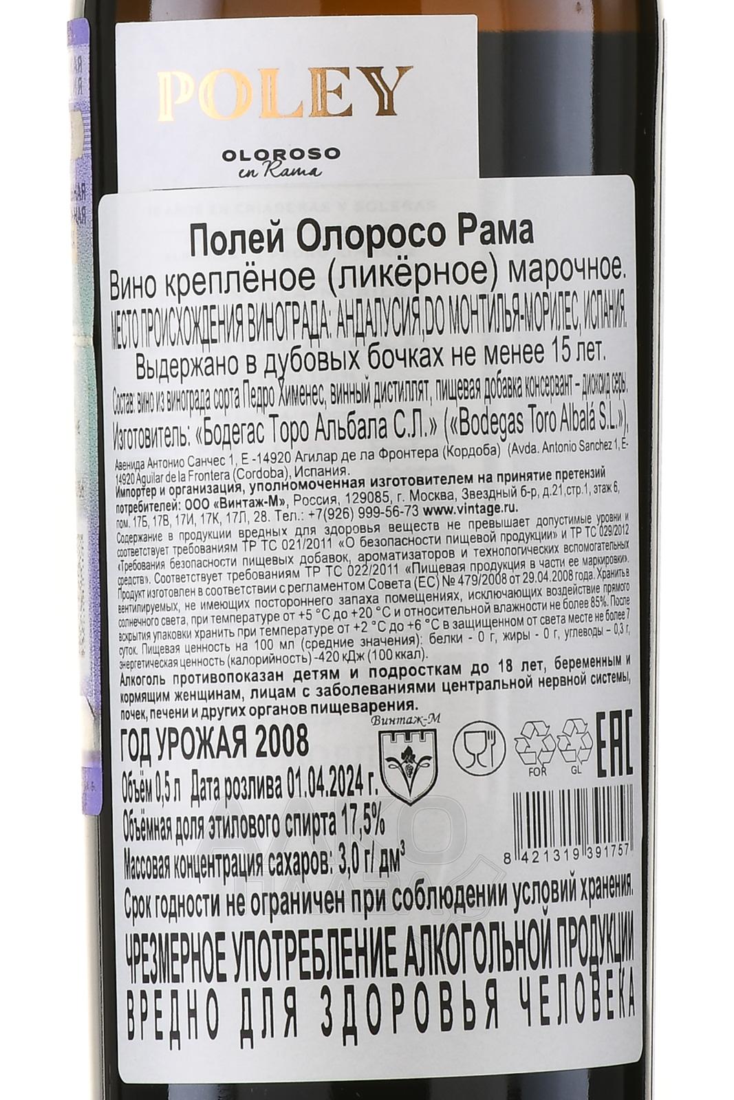 Херес Toro Albala Poley Oloroso Rama 0,5 л создано в андалузском регионе Монтийя-Морилес, который известен своими известняковыми почвами и жарким климатом. Виноград здесь получает высокую концентрацию сахара благодаря долгому солнечному периоду и низкому количеству осадков. Сырьем служит сорт Pedro Ximenez, выращенный на склонах с альбарисой – белыми меловыми почвами, способными удерживать влагу даже в засушливые годы. Урожай собирается вручную, ягоды проходят традиционное прессование, затем сусло сбраживается с последующим укреплением винным спиртом. Напиток выдерживается по системе солера в бочках из американского дуба. Этот метод позволяет сочетать вина разных винтажей (годов), создавая стабильный и гармоничный стиль. Олоросо отличается от других хересных образцов отсутствием флора на поверхности при выдержке, что дает насыщенный, крепкий вкус и густую структуру.