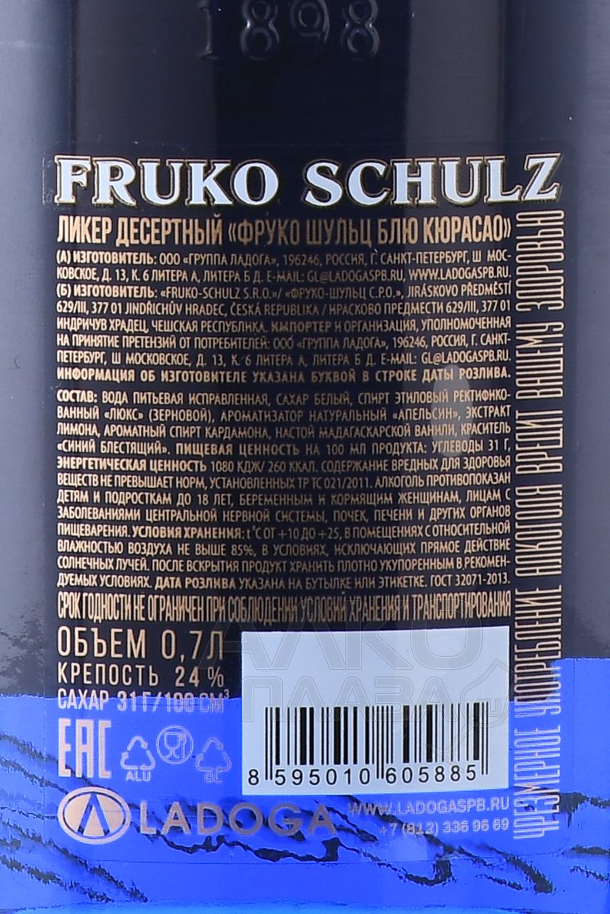 В состав чешского ликера Fruko Schulz Blue Curacao входят только натуральные ароматизаторы, вода высокой степени очистки, кардамон и восхитительная мадагаскарская ваниль. Основа для производства ликера — особый горький сорт апельсинов, который носит название лахара. Лахара произрастает на острове Кюрасао в Карибском море. На самом деле, это потомки валенсийских апельсинов, которые на остров завезли испанские переселенцы. Из-за отсутствия воды и плохих условий для выращивания плодов, большие, сладкие валенсийские апельсины со временем приобрели горечь и уменьшились в размерах. Цедра и кожура лахары содержат эфирные масла, обладающие приятным, запоминающимся ароматом, и сначала их с успехом использовали в косметологии. Но со временем экстракт горьких апельсинов стали добавлять в спиртные напитки, так появился известный во всем мире ликер Curacao. Окрашивание ликеров Curacao в различные цвета делает их привлекательными для изготовления коктейлей. Специальная натуральная добавка, придающая Blue Curacao экзотический небесно-синий цвет, позволяет барменам создавать настоящие шедевры.